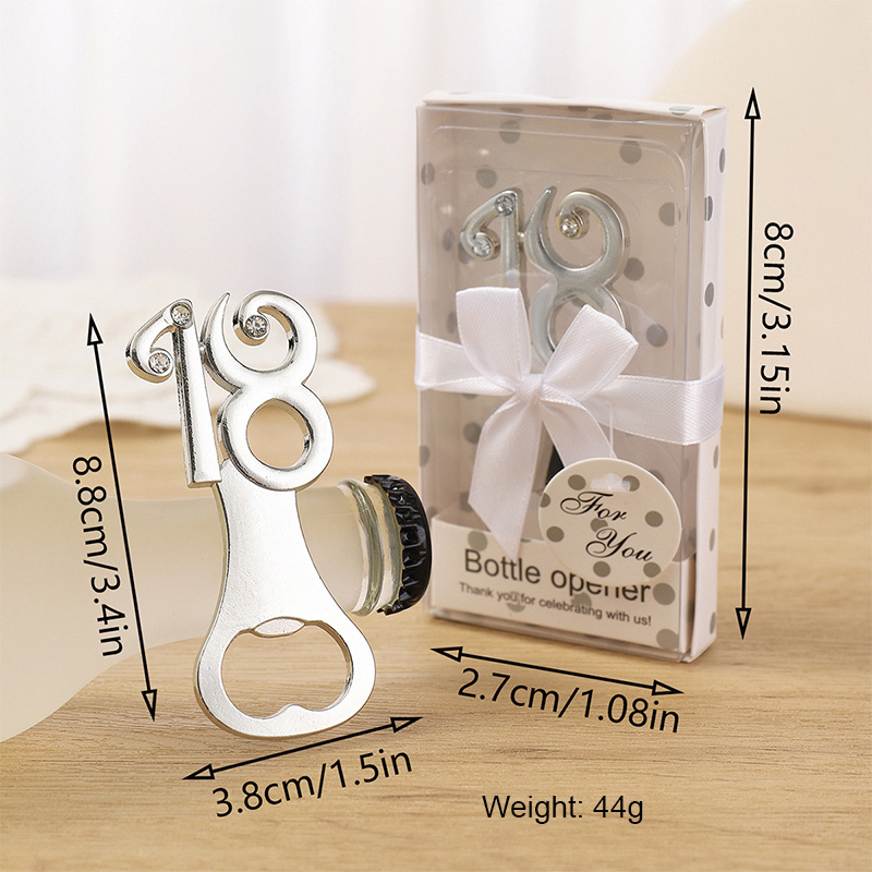 This 44g (8.8cm) silver opener features a sparkling "18" design with embedded crystals. It easily removes bottle caps, making it a perfect commemorative gift for 18th birthdays, milestone celebrations, or adding a festive touch to adult gatherings.