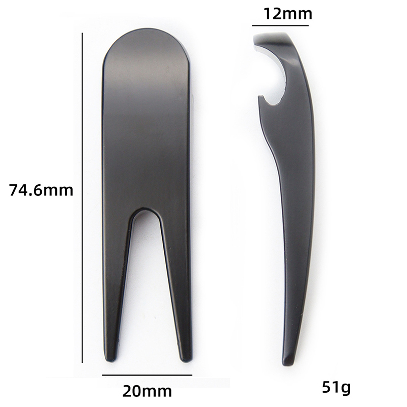 This 51g (74.6mm) black tool doubles as a divot repair fork and bottle opener. Adorned with a white 4-leaf clover, it’s sleek, durable, and practical—perfect for fixing greens mid-round, then popping open a post-game drink with a touch of luck.