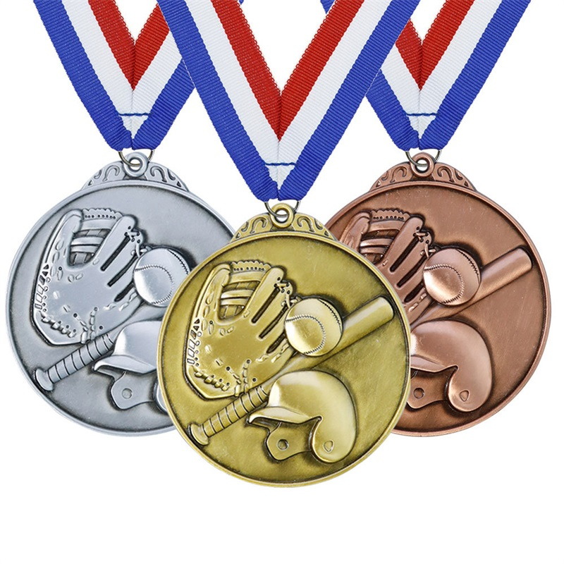 These circular baseball medals (antique gold, silver, copper) feature baseball gloves, bats, balls, and helmets. They’re for baseball tournaments, awarding athletes in sports ceremonies.