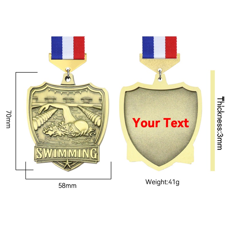 This shield-shaped swimming medal (in antique gold/silver/copper) is ideal for all swimming events—from interschool meets and regional championships to amateur leagues. It serves as a top-three award, honoring athletes’ efforts in the pool and adding professionalism and prestige to award ceremonies.
