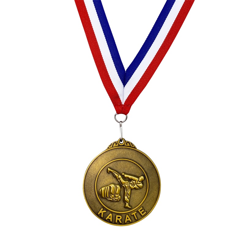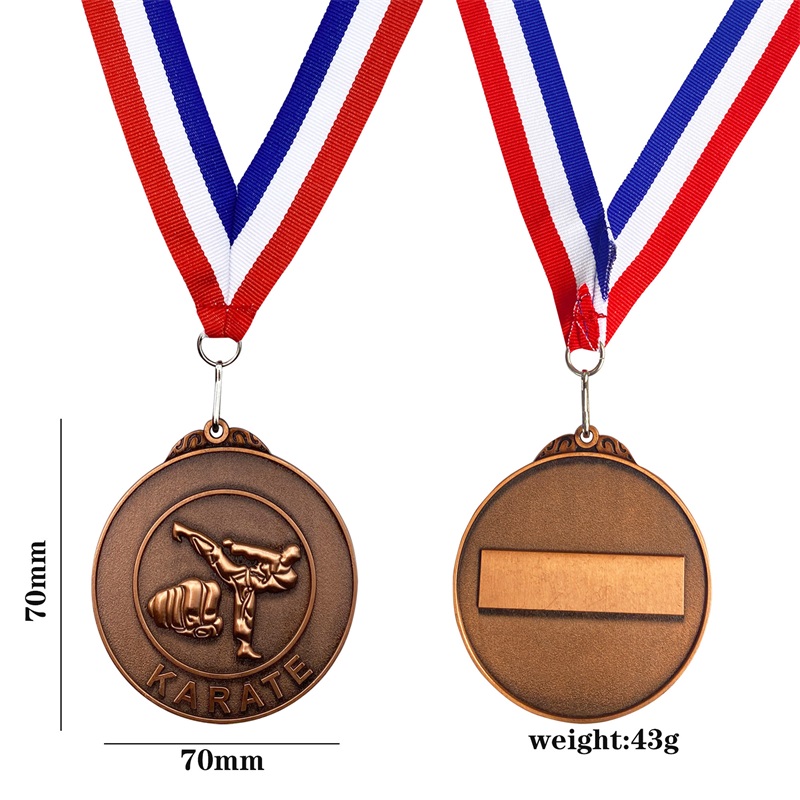 Crafted from antique gold/antique silver/antique bronze metal, this karate medal blends retro, weathered texture with crisp embossed motifs: a dynamic kick stance and fist—iconic of the discipline—paired with bold "KARATE" lettering. It’s a distinguished, nostalgia-tinged honor for recognizing tournament skill in traditional martial arts.
