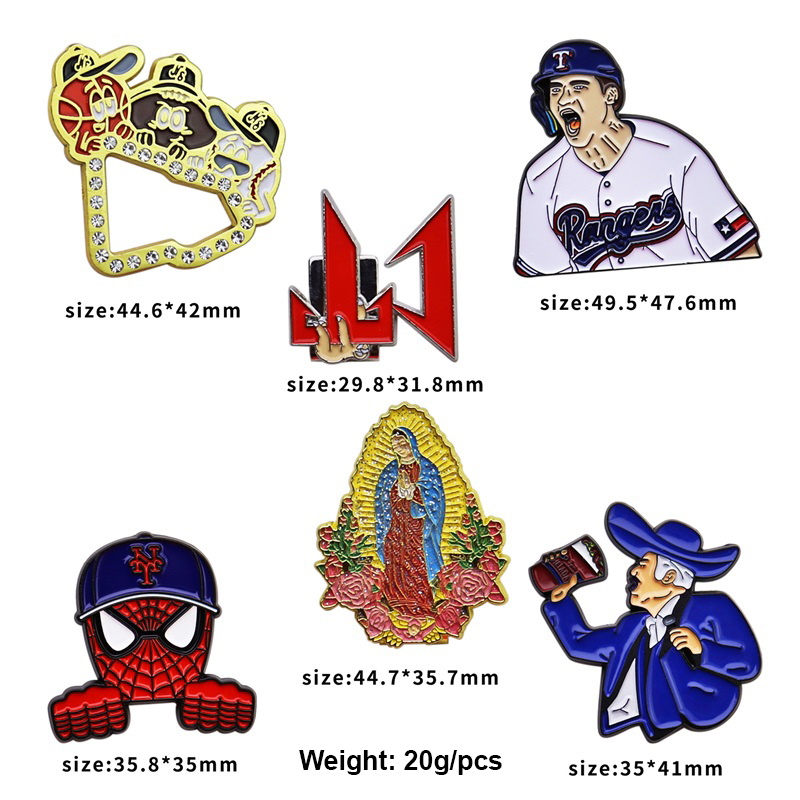 These pins feature diverse shapes: baseball player silhouettes, Spider-Man cap contours, cowboy figures, and more. Designed with vibrant enamel hues, rhinestone trims (on some), intricate details, and metallic outlines, they blend vivid styling for eye-catching hat/bag decor.