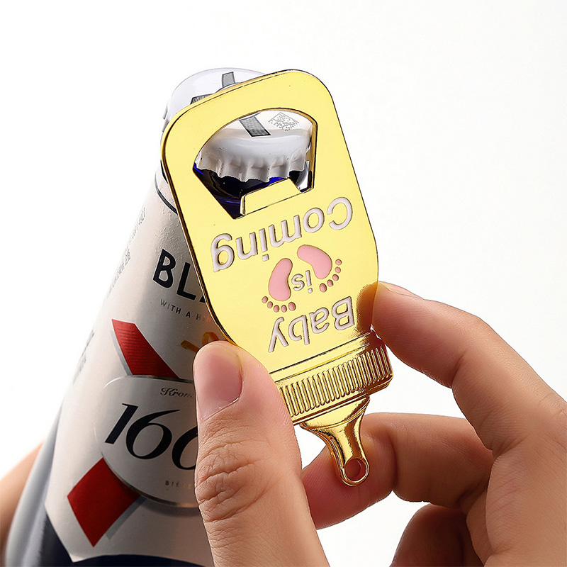 This 30g (7.8cm) shiny gold opener mimics a baby bottle, etched with "Baby is Coming" and tiny footprints. It pops caps easily, blending sweet baby-themed charm with festive flair—ideal for baby showers, gender reveals, or a heartfelt gift for expecting parents.