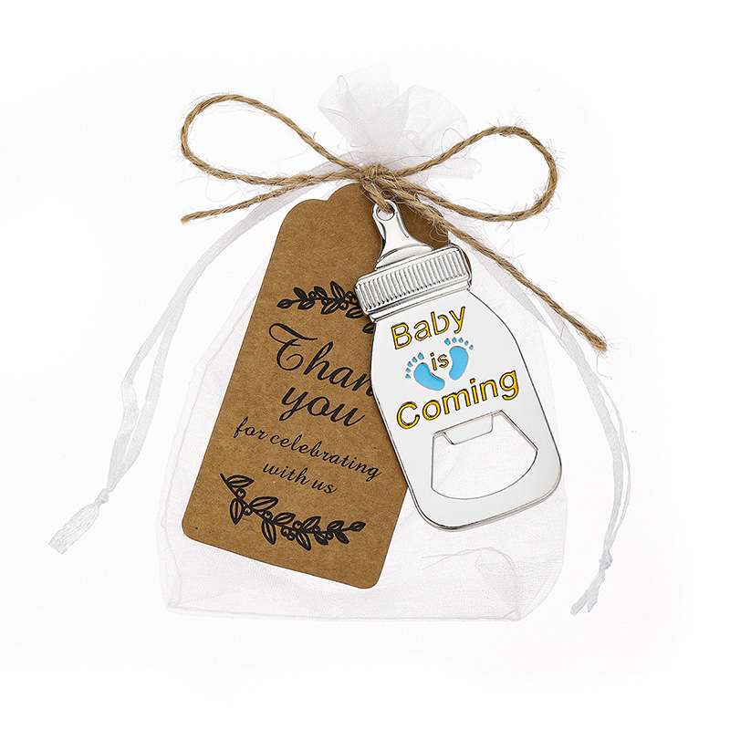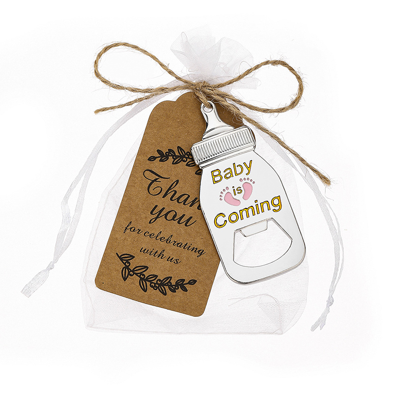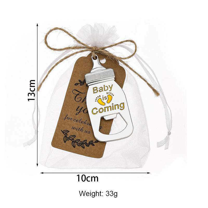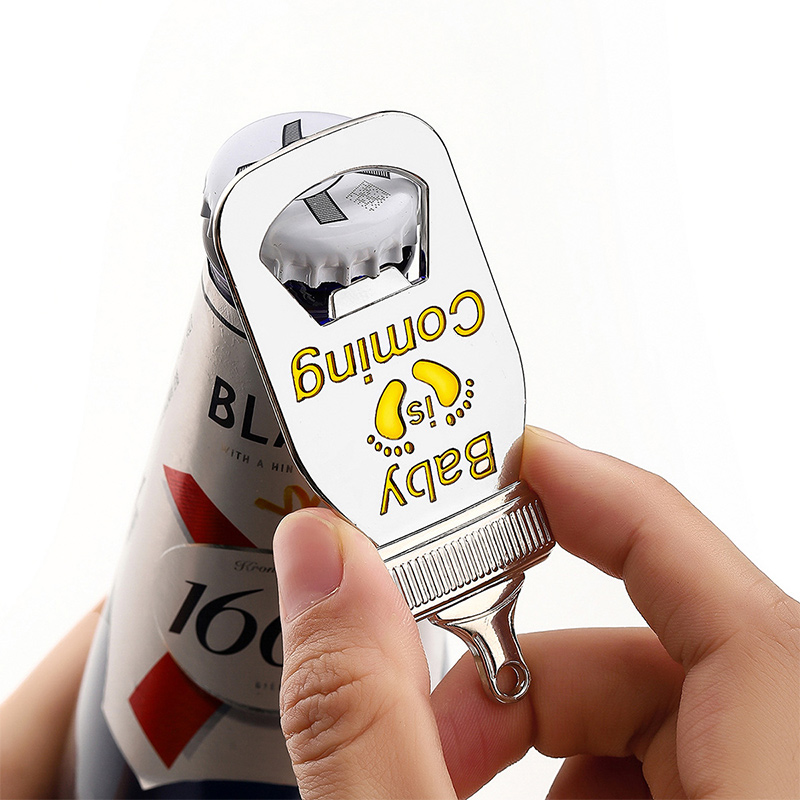 This 30g (7.8cm) silver opener mimics a baby bottle, printed with "Baby is Coming" and tiny footprints (in pink/blue/yellow). It pops caps easily, blending sweet baby-themed charm with festive flair—ideal for baby showers, gender reveals, or a heartfelt gift for expecting parents.
