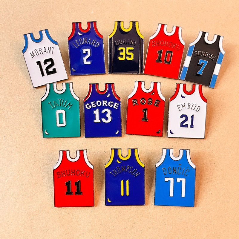Sports Fan AdornmentsSelling Points: These vivid enamel pins feature iconic NBA/Anime jersey designs (Morant, Durant, Sakuragi, etc.) with player names & numbers. Polished, team-colored styles add sporty flair to bags/jackets—ideal for basketball fans as collectible, fandom-focused keepsakes.