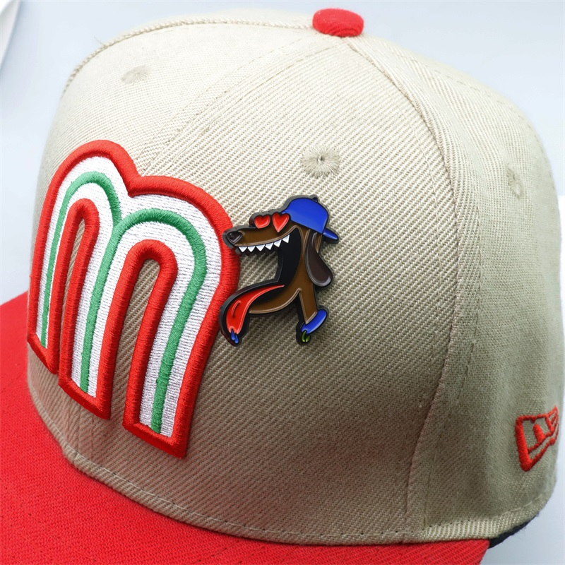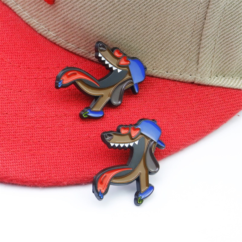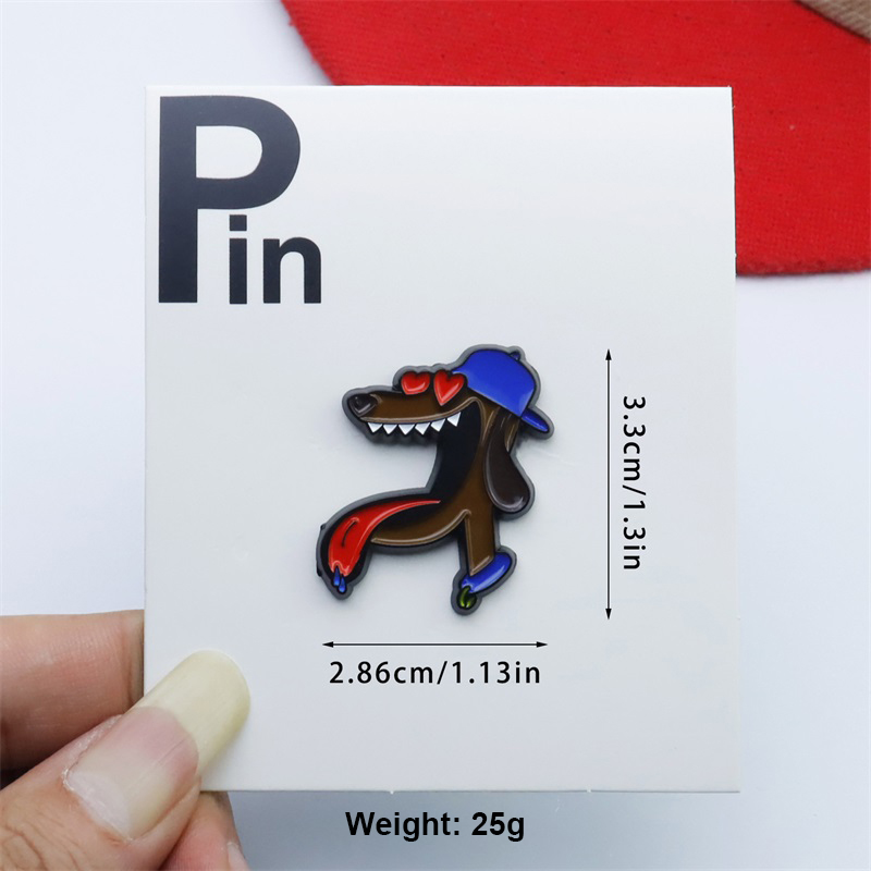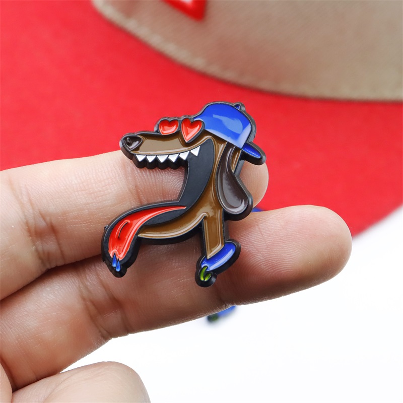 These pins feature exaggerated cartoon dog silhouettes—adorned with blue caps, heart-shaped eyes, and jagged mouths, in vibrant brown/blue/red enamel. Used to adorn caps or bags, they add quirky, playful charm, perfect for those favoring fun, eye-catching flair to their accessories.