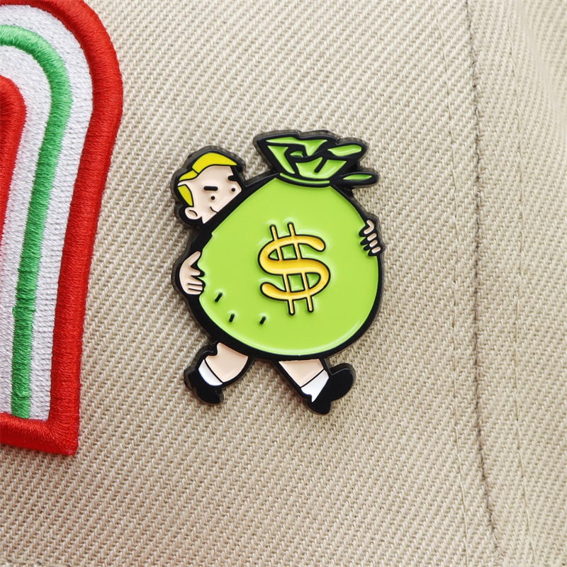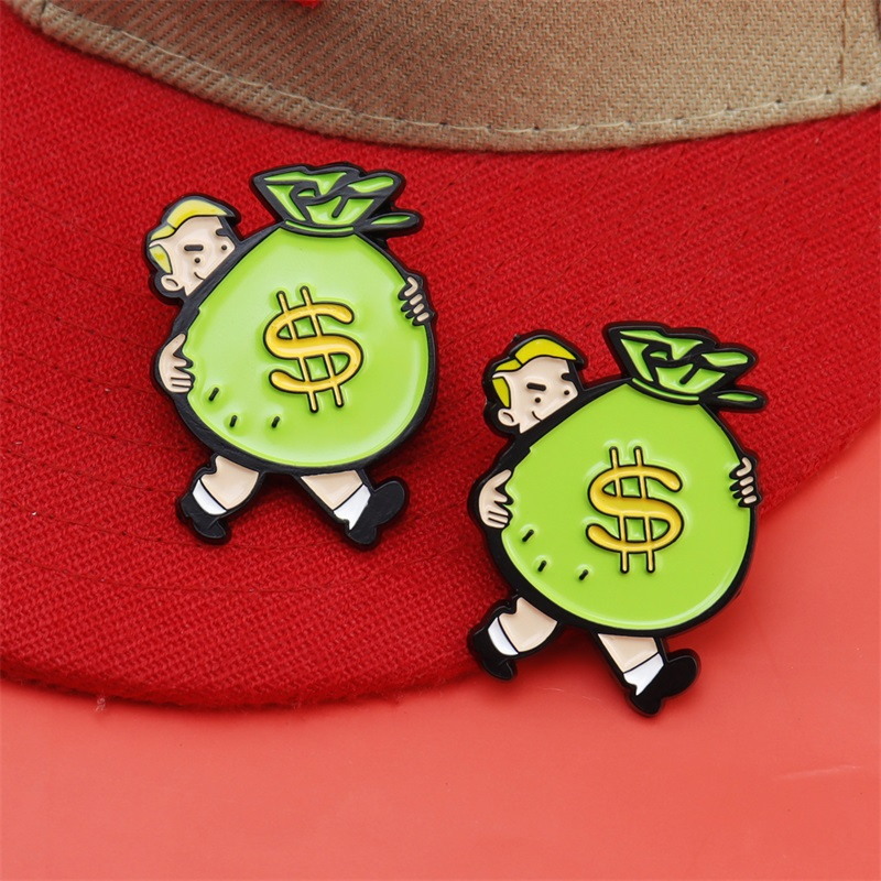 Playful Cap/Bag DecorBoasting vivid green money bags (with $ symbols) carried by cute cartoon figures, these bright, playful pins add fun, whimsical flair to caps/bags—ideal for those favoring cheerful, fortune-themed accessories.