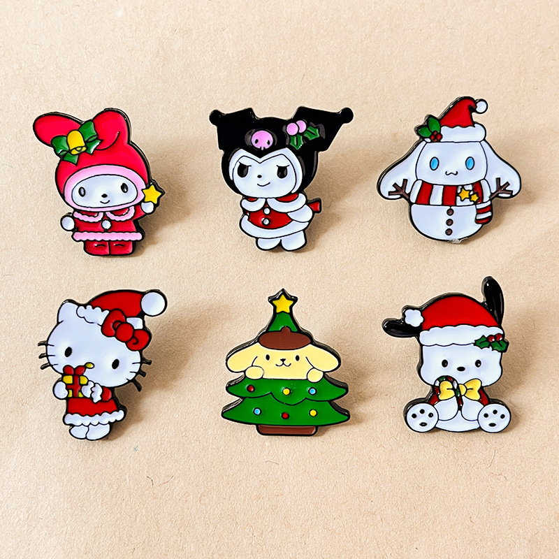 Features 6 holiday-themed Sanrio characters (Hello Kitty, My Melody, etc.) in Christmas attire—cheerful, iconic flair. Perfect for Sanrio fans to add festive charm to bags/jackets, ideal for seasonal styling or holiday decor.