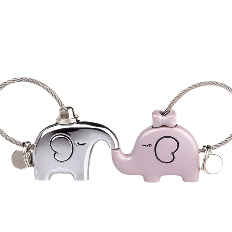 This keychain set features two elephant charms—one gunmetal gray, one rose gold—made of polished metal, with silver cable loops. The metallic finish is sleek, and the contrasting colors make them a stylish, durable pair for couples.