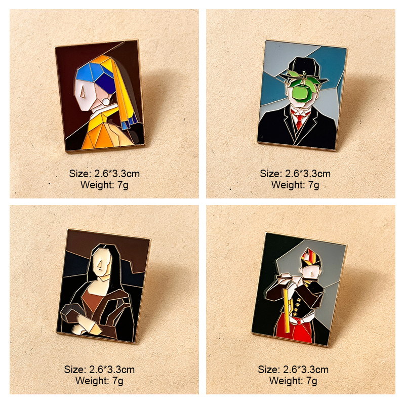 Features iconic artworks (Mona Lisa, Girl with a Pearl Earring) reimagined in bold cubist styles, with crisp enamel & gold borders. Ideal for art lovers to decorate bags, blazers, or hats—adds sophisticated, artistic flair to any look.