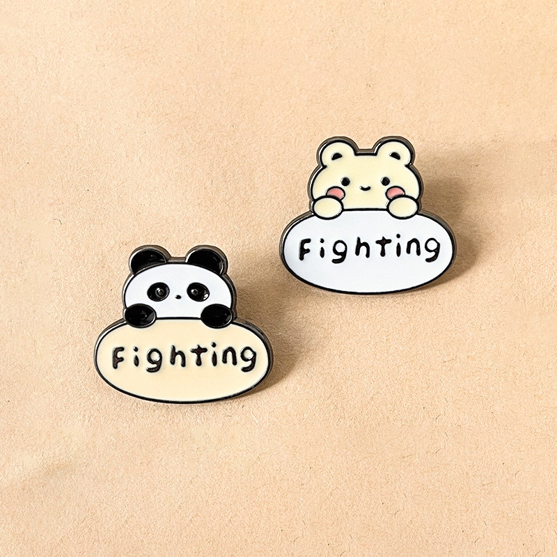 These charming enamel pins (smooth finish, crisp metal outlines) feature a panda and bear peeking over "Fighting" plaques—blending adorable animal charm with uplifting vibes. Perfect for adding cheerful motivation to bags/jackets or gifting as heartfelt keepsakes.
