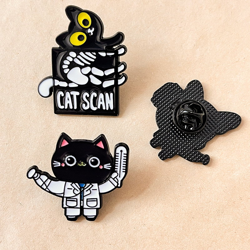 3 playful pins feature a "CAT SCAN" skeleton cat, doctor cat (with thermometer), and doctor bulldog (with first aid)—charming designs blend pet cuteness with medical themes. Perfect for adding quirky flair to bags/jackets or displaying as whimsical healthcare collectibles.