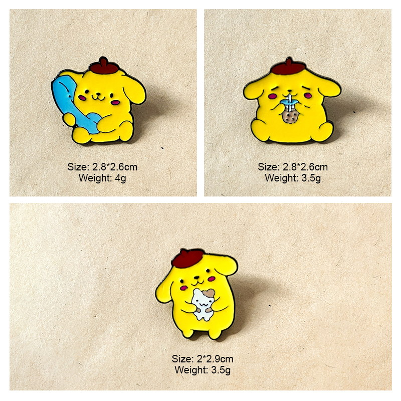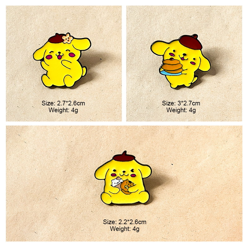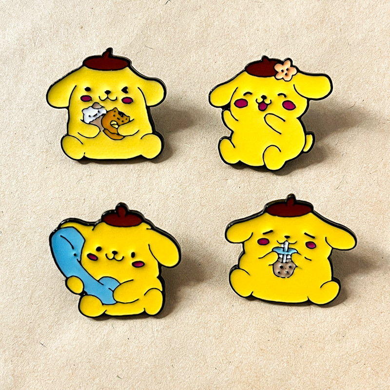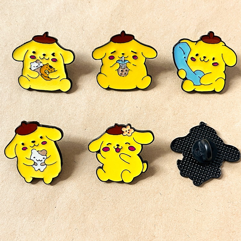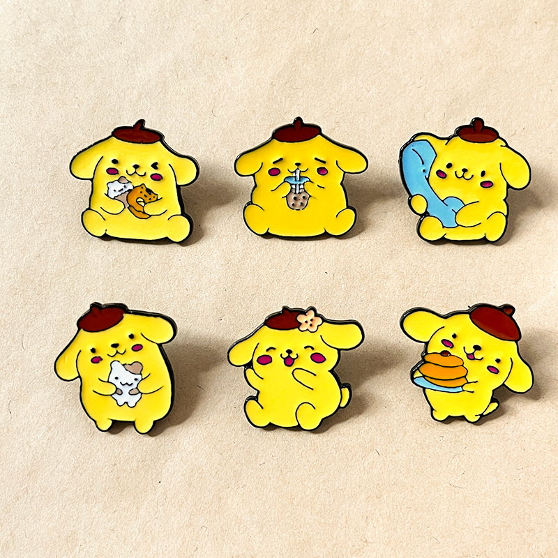 6 charming Pompompurin pins (snacking, sipping boba, holding plush) — vivid enamel, soft expressions. Perfect for adding sweet flair to bags/jackets; ideal for Sanrio fans’ daily wear or cute collectibles.