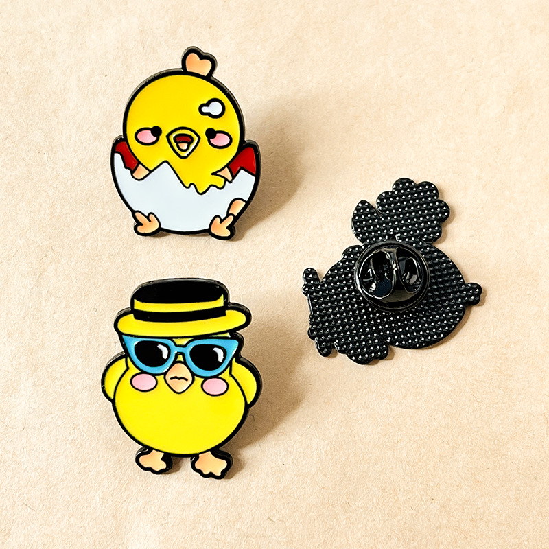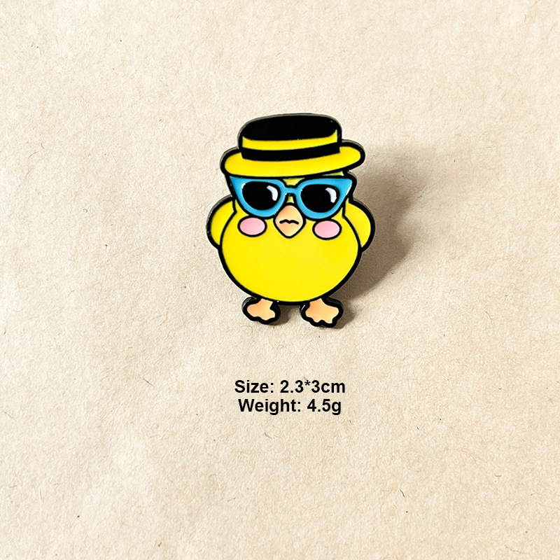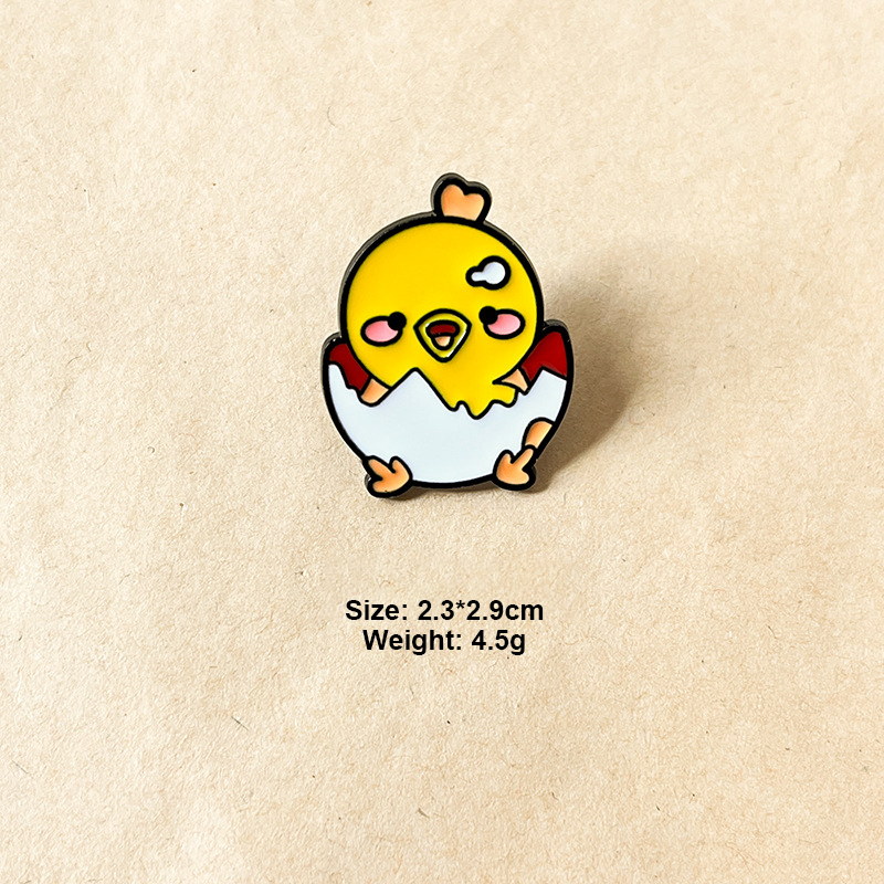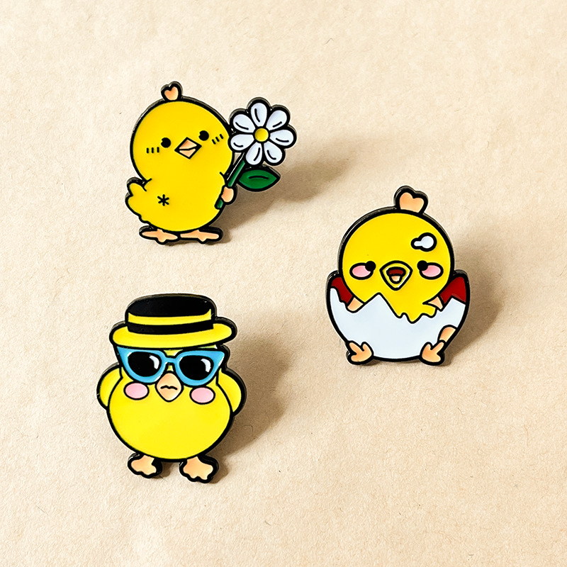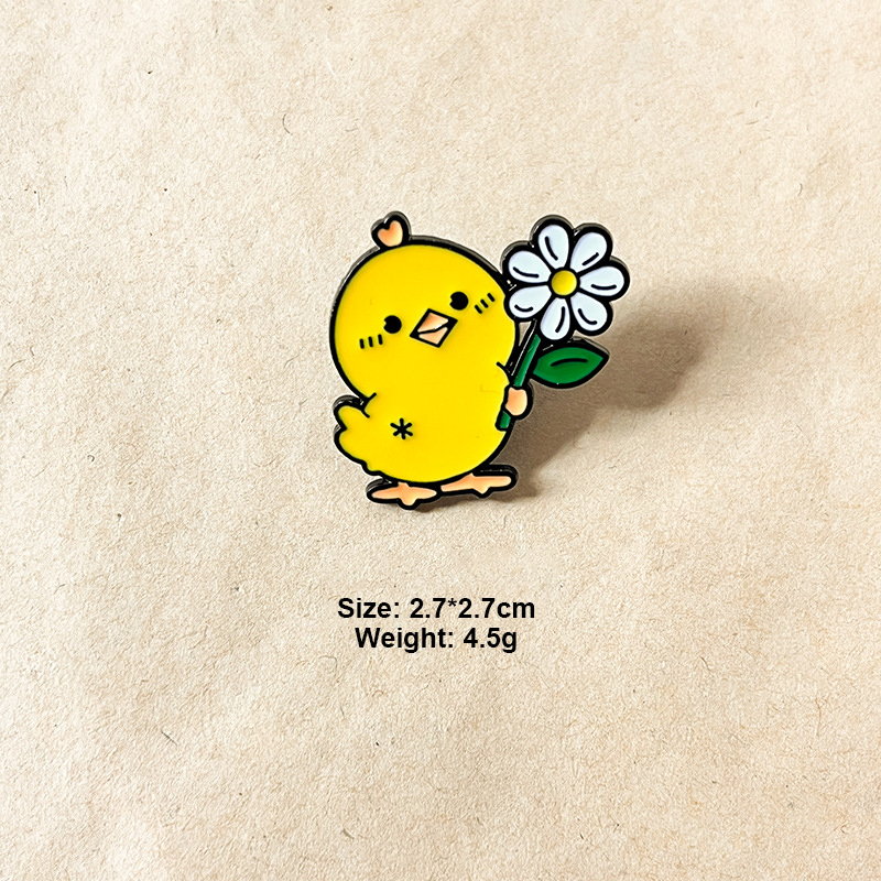 Features 3 whimsical chick designs (flower-carrying, eggshell, stylish hat) in glossy enamel. Perfect for adding sweet, playful charm to bags, jackets, or hats—ideal for daily styling or cute accessory decor.