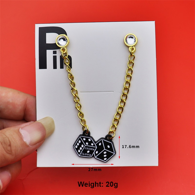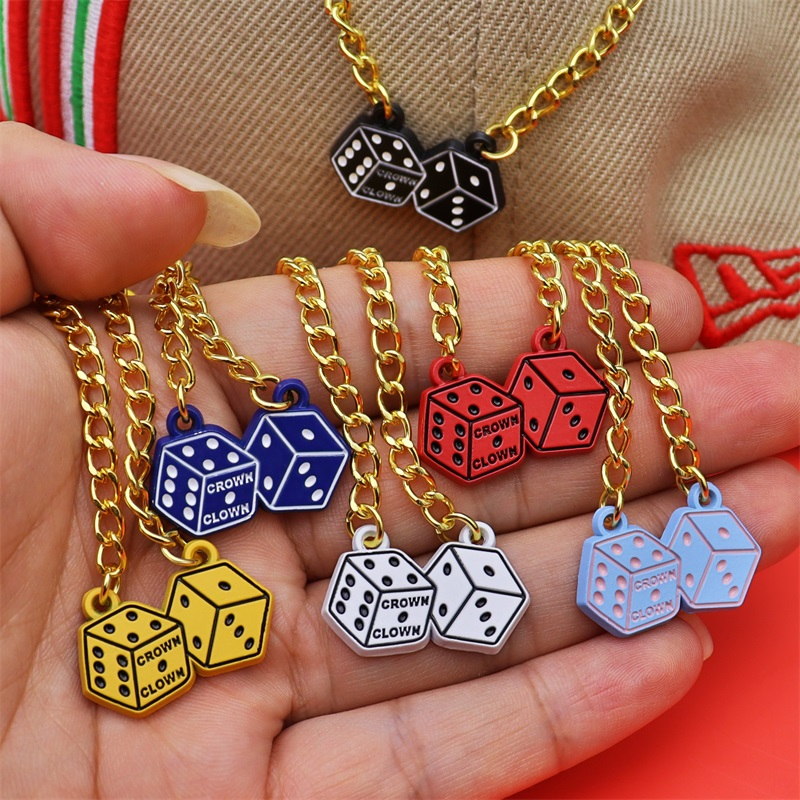 These accessories feature 2D dice shapes (with numbered faces + "Crown Clown" lettering) paired with Rubber accessories, linked by glossy gold chains. Designs blend bold, solid hues (yellow/blue) with playful, iconic motifs—vibrant, eye-catching, and full of whimsical personality.