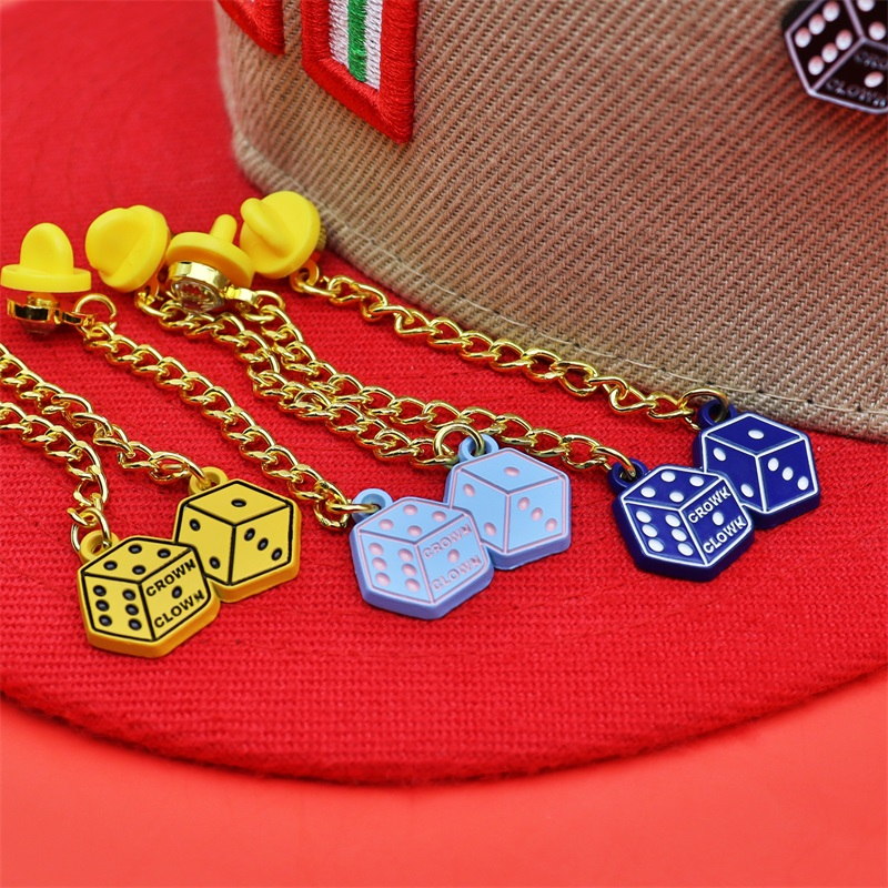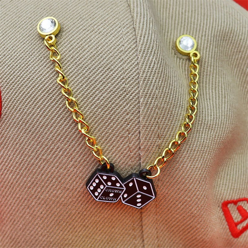 Vibrant yellow/blue dice (with "Crown Clown" text) paired with gold chains & Rubber accessories—playful, bold accessories to elevate hat styling.