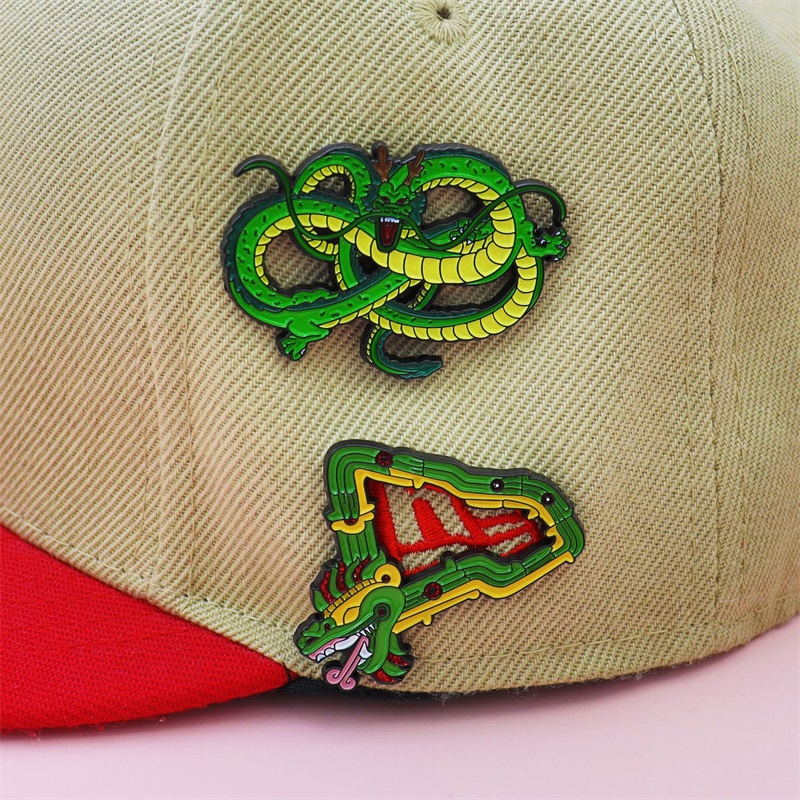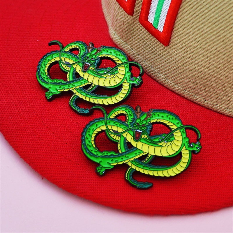 Iconic Shenron dragon designs (coiled silhouette, bold green/yellow hues) with sharp details. Two stylized options—authentic anime flair, vibrant enamel, perfect for adding fandom charm to hats/bags.