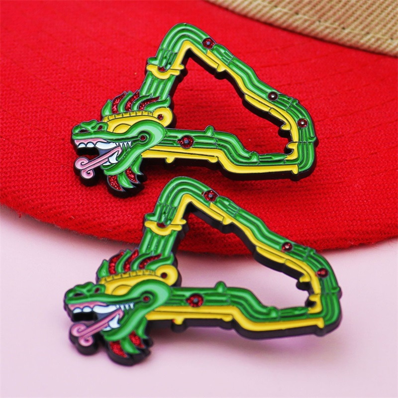 These pins feature dynamic, coiled dragon silhouettes (with curved, winding shapes) and angular, stylized dragon head outlines. Designs blend bold green/yellow enamel, sharp line details, and iconic Shenron features—capturing anime authenticity with eye-catching, dimensional styling.