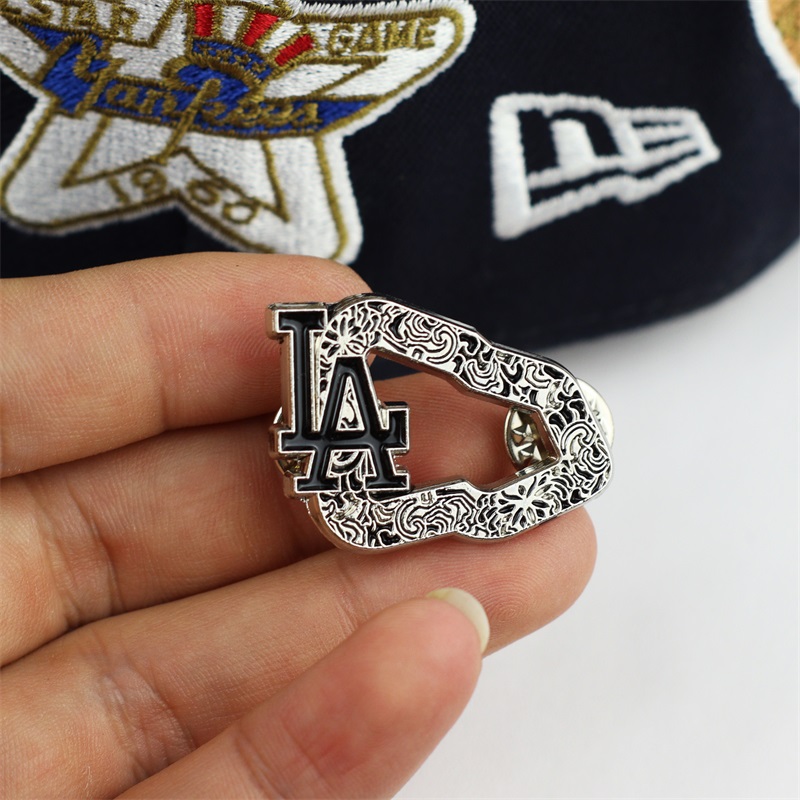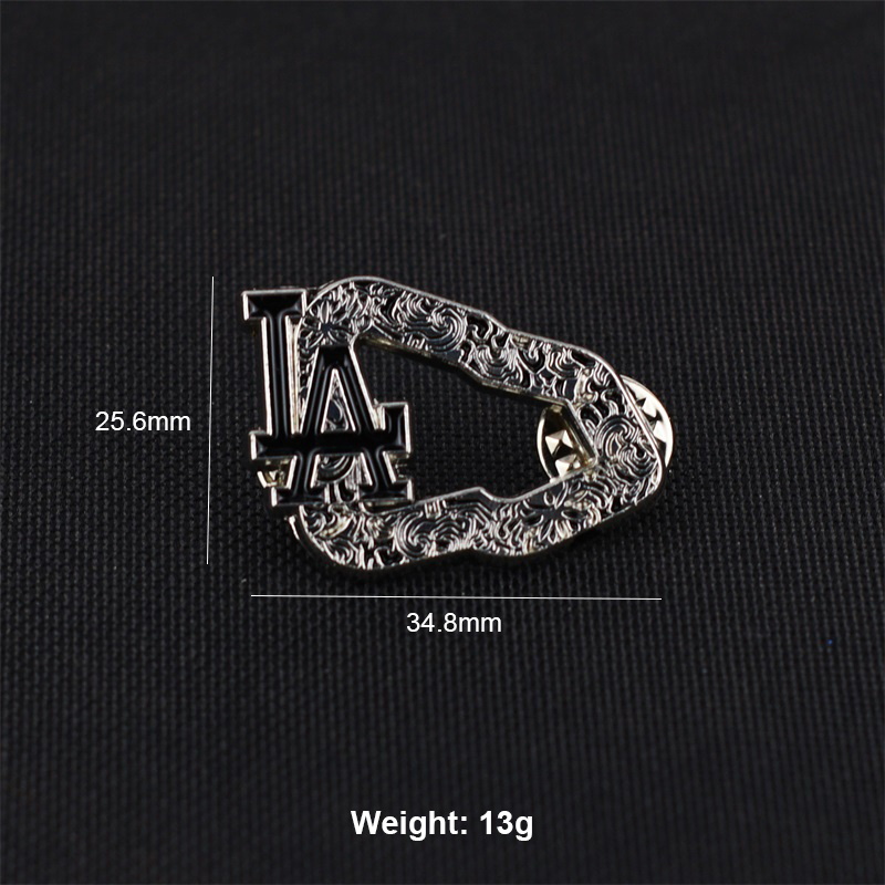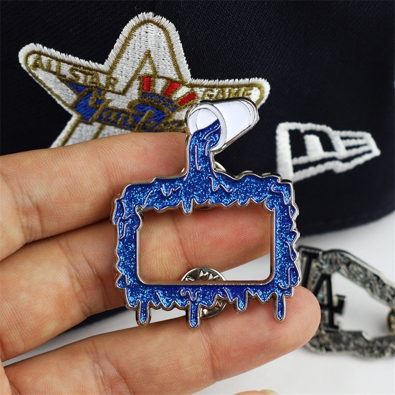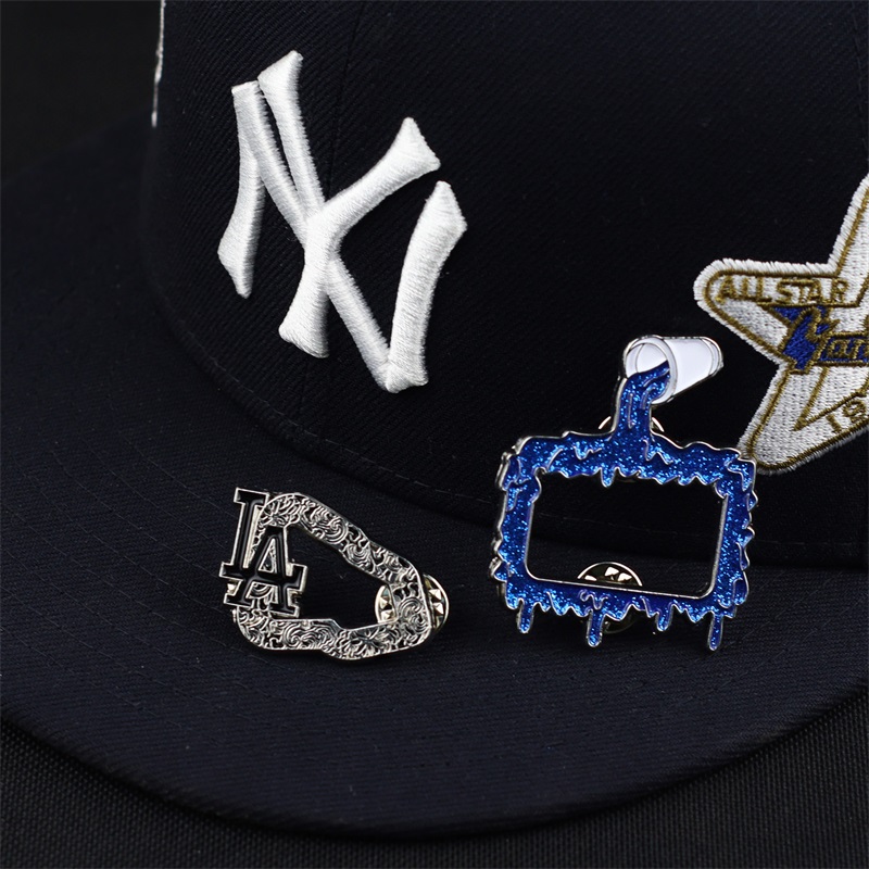 These pins feature two shapes: a blue glitter drip frame, and a silver LA logo with intricate patterns (both in metallic frames). They decorate caps or bags, adding unique trendy flair—ideal for fashion lovers to elevate outfits with stylish, eye-catching details.