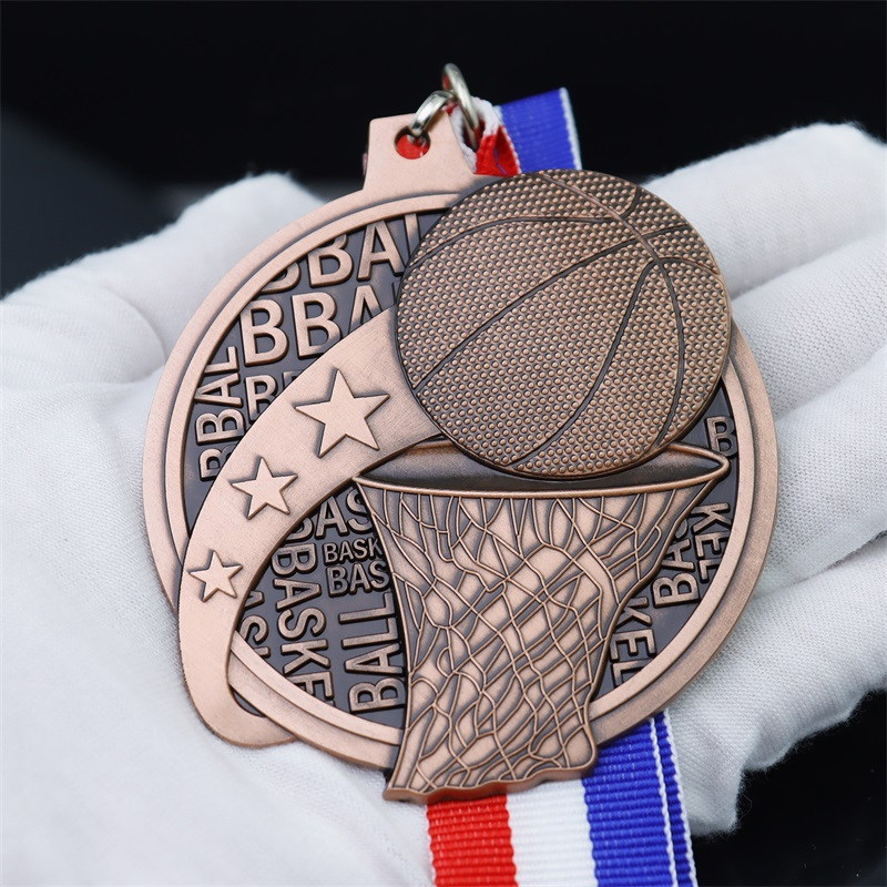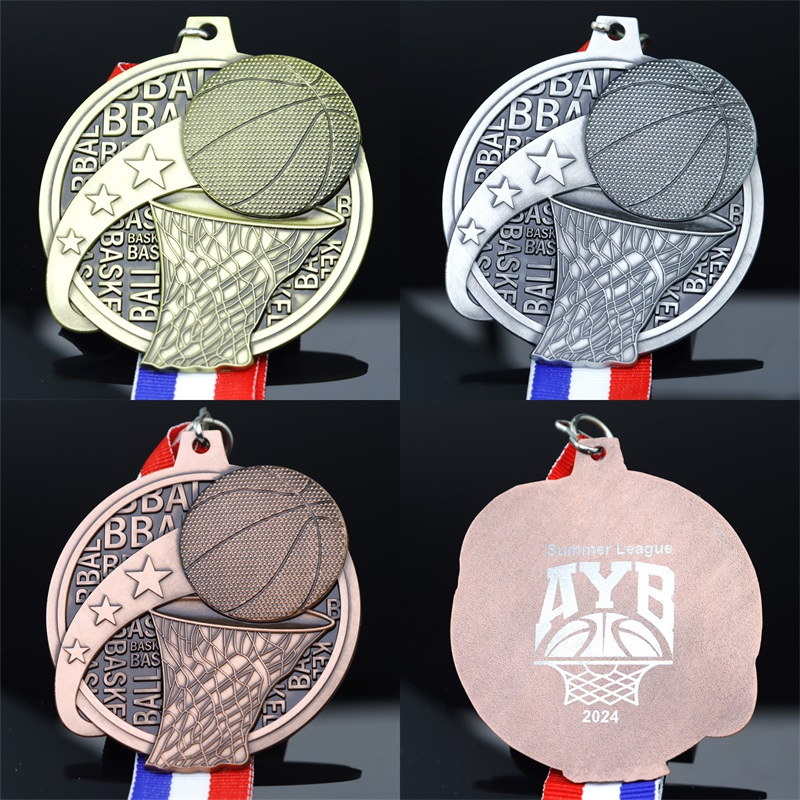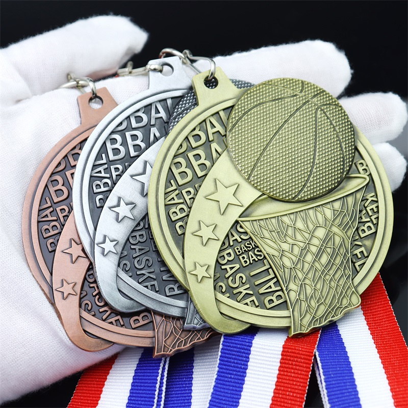 This basketball medal (gold/silver/copper metal) features textured 3D basketball and net motifs, paired with repeating "BASKETBALL" lettering and star accents. Its dynamic, sport-focused design mirrors the energy of the game, making it a vivid, fitting honor for basketball tournament achievements.