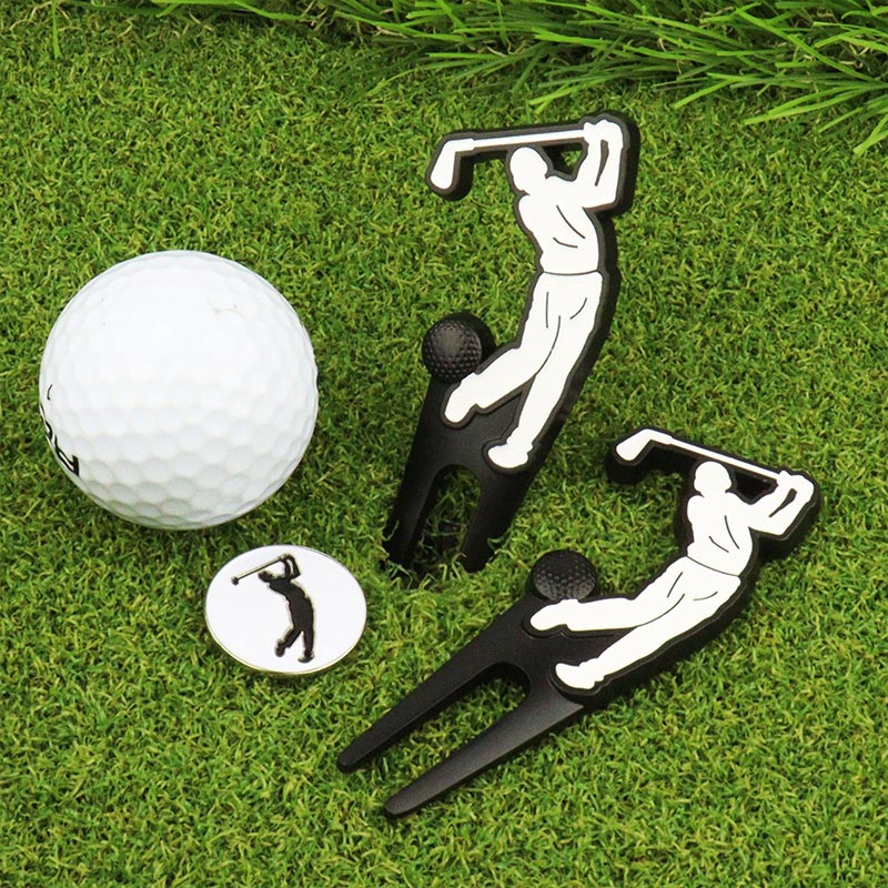 This 42g (90.17mm) tool features dynamic golfer silhouettes (male/female) in black & white. It includes a matching ball marker, has a 4mm thick durable build, and simplifies green repairs—stylish, functional, and perfect for adding on-course personality.