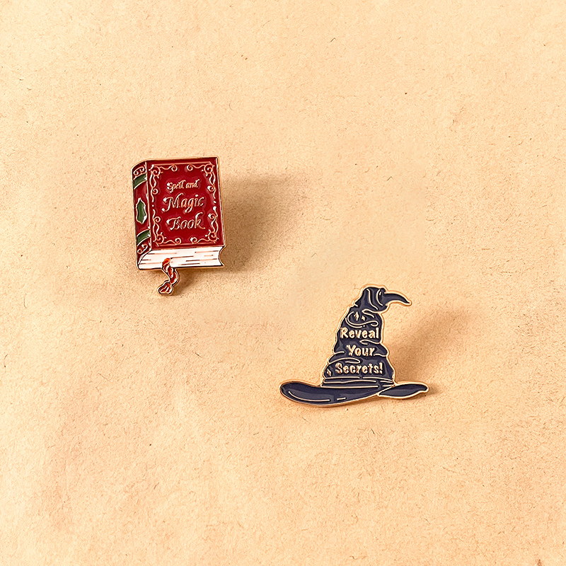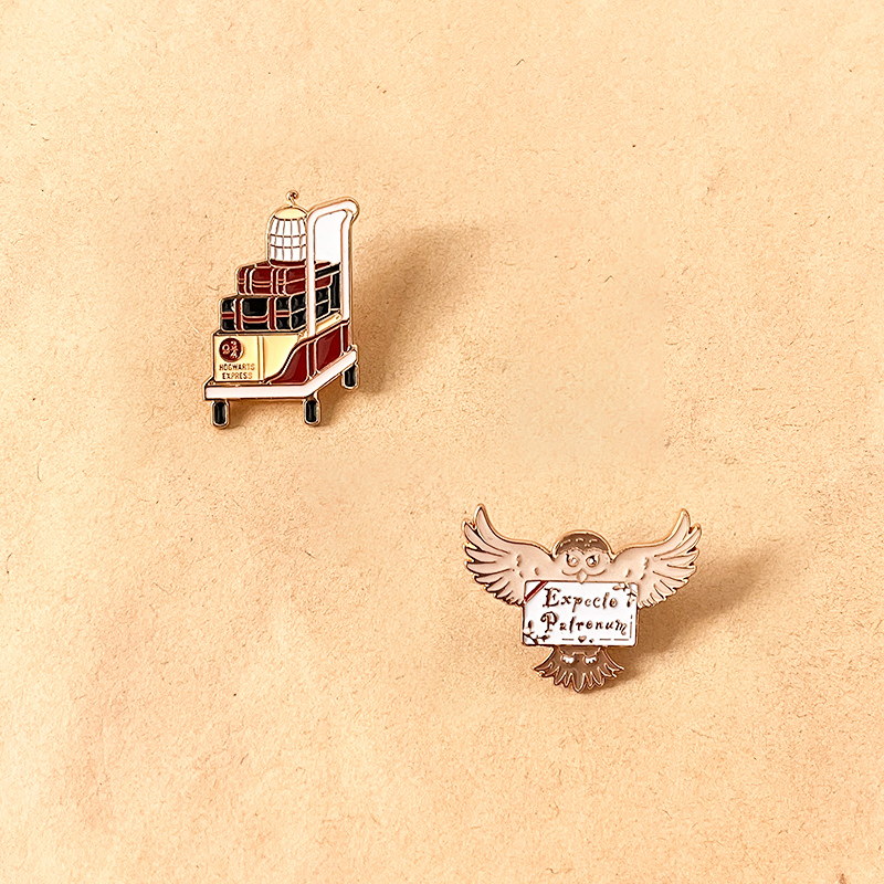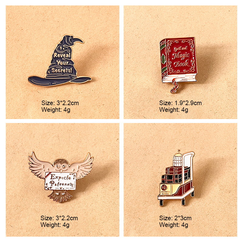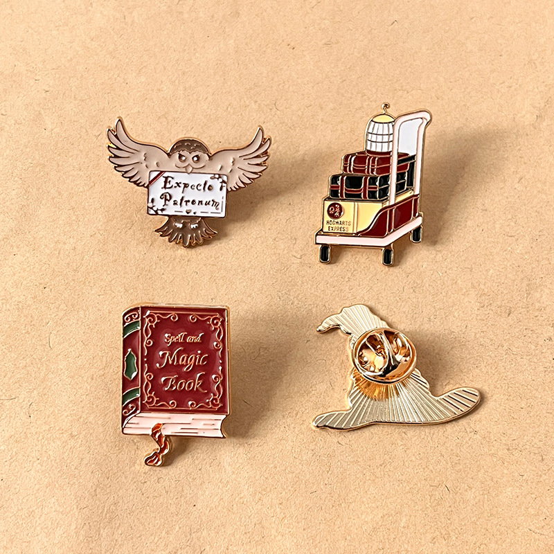 These Harry Potter pins feature 4 whimsical shapes—Hogwarts luggage cart, Sorting Hat, magic book, and owl (with spell sign), boasting vivid IP details. They decorate caps or bags, adding magical flair, perfect for HP fans to infuse accessories with iconic wizarding charm.