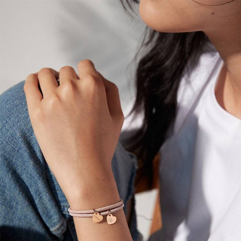 Offered in black, pink, light blue, and white, this leather cord bracelet boasts a flexible knotted fit and two sleek gold heart charms. Its understated blend of casual cord texture and delicate metallic details makes it a versatile pick—perfect for layering with other pieces or wearing alone as a subtle, heartfelt accent.