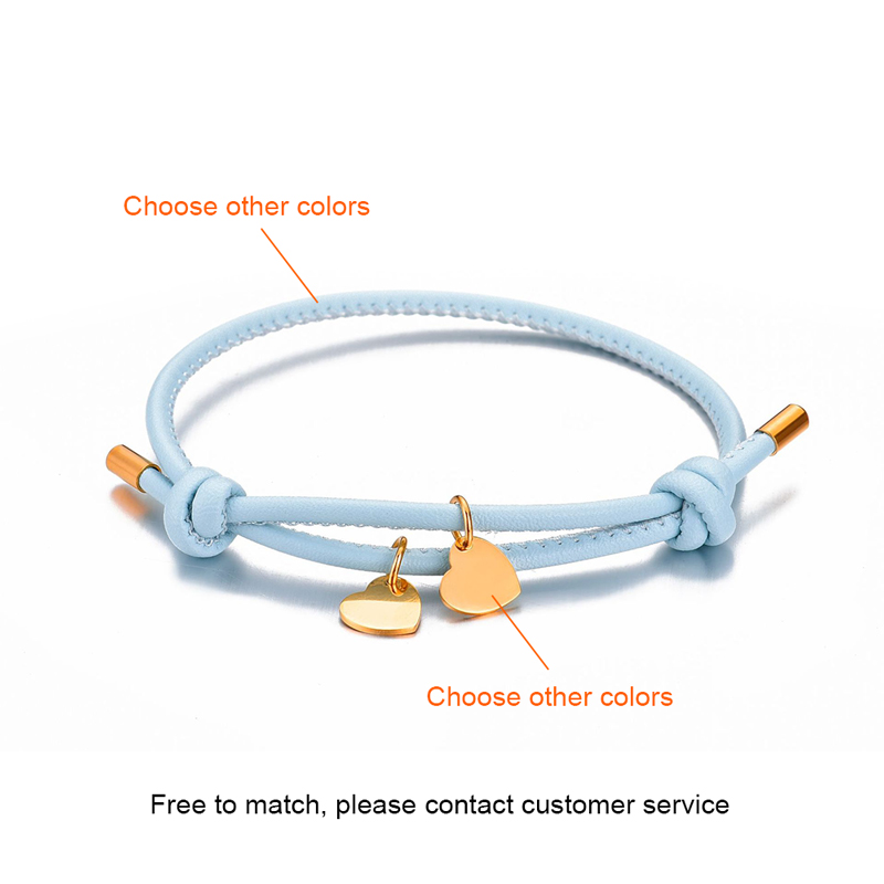 This adjustable leather cord bracelet (in black, pink, light blue, white) features two dainty gold heart charms. Its knotted closure ensures a custom fit, blending casual leather texture with sweet, minimalist accents—ideal for daily wear or gifting as a heartfelt accessory.