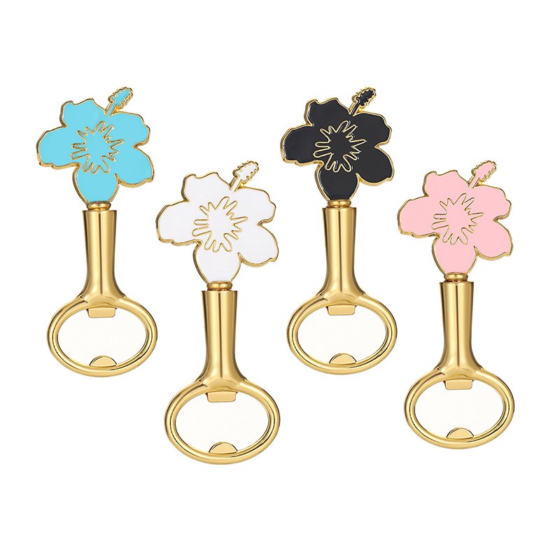 This 48g (9.6cm) opener features a vibrant hibiscus flower top (in blue/white/black/pink enamel) paired with a gold handle. It pops caps smoothly, blending tropical floral charm with playful color—ideal for luau parties, beach weddings, or a cheerful gift for flower lovers.