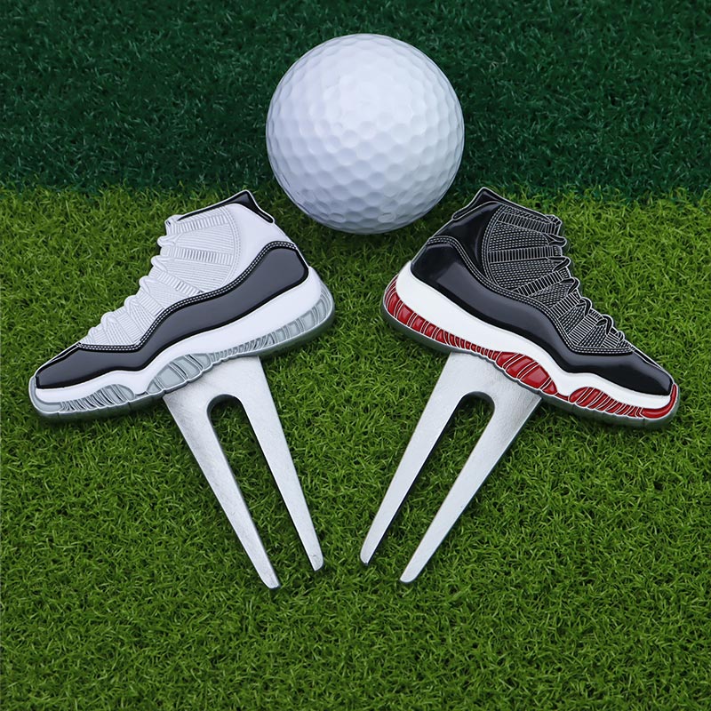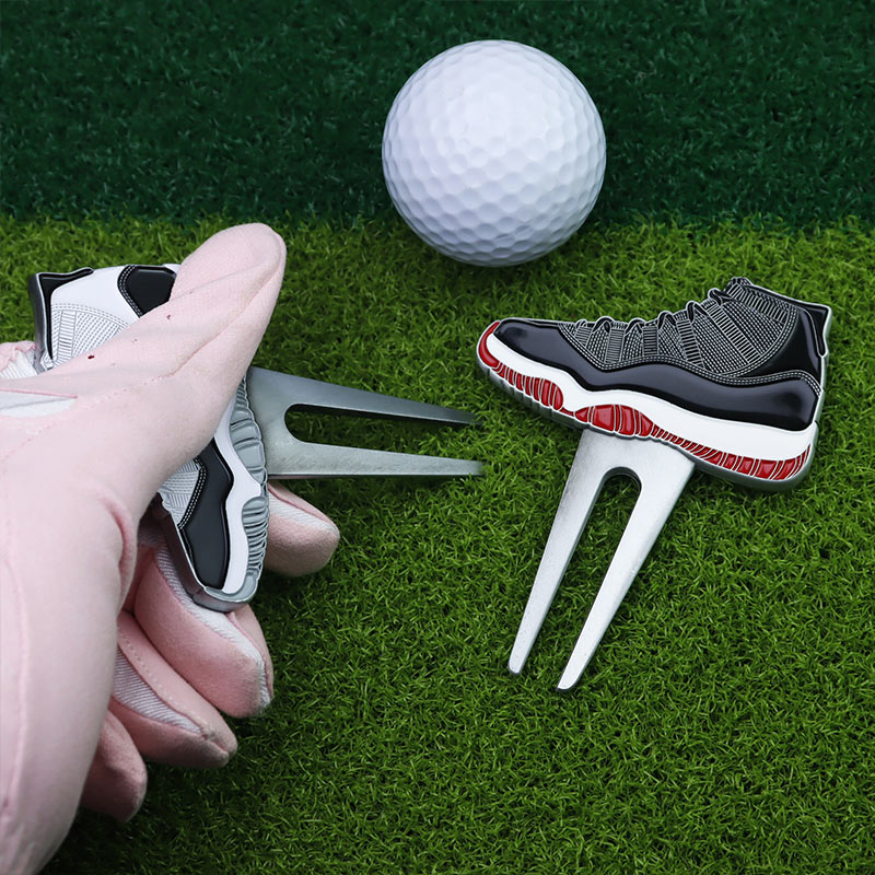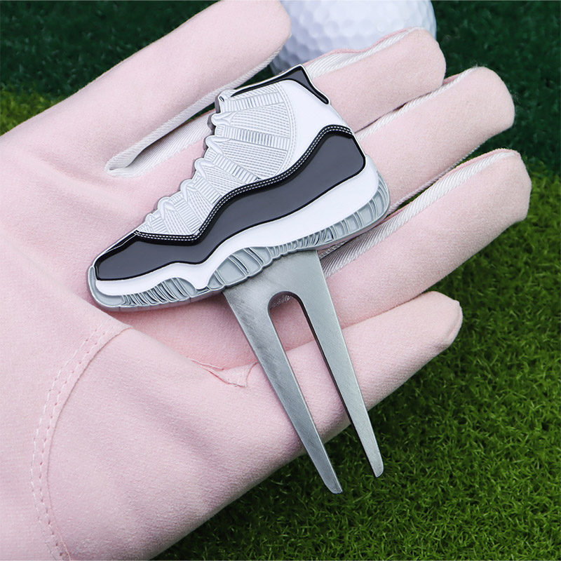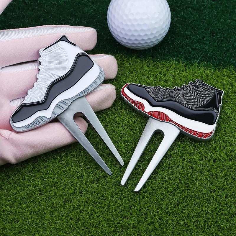 This 55g (92mm) high-top sneaker-shaped tool (black/white/red) fixes green divots with its 5mm durable build. Its detailed iconic shoe design blends streetwear flair with on-course functionality—perfect for golfers craving style and utility.