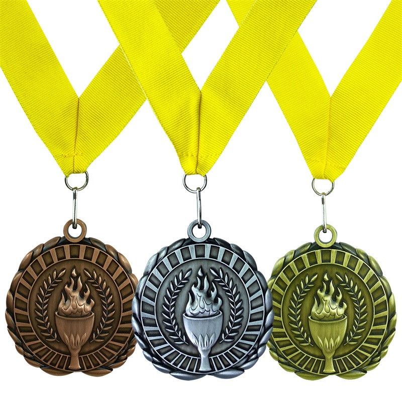 Crafted from antique gold/antique silver/antique red copper metal, this medal blends weathered, retro texture with a crisp embossed torch motif (symbolizing sports passion) framed by laurel wreaths. It serves as a distinguished, nostalgia-tinged honor for celebrating achievements at athletic meets, tournaments, and sports ceremonies.