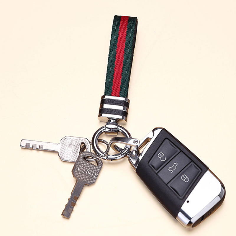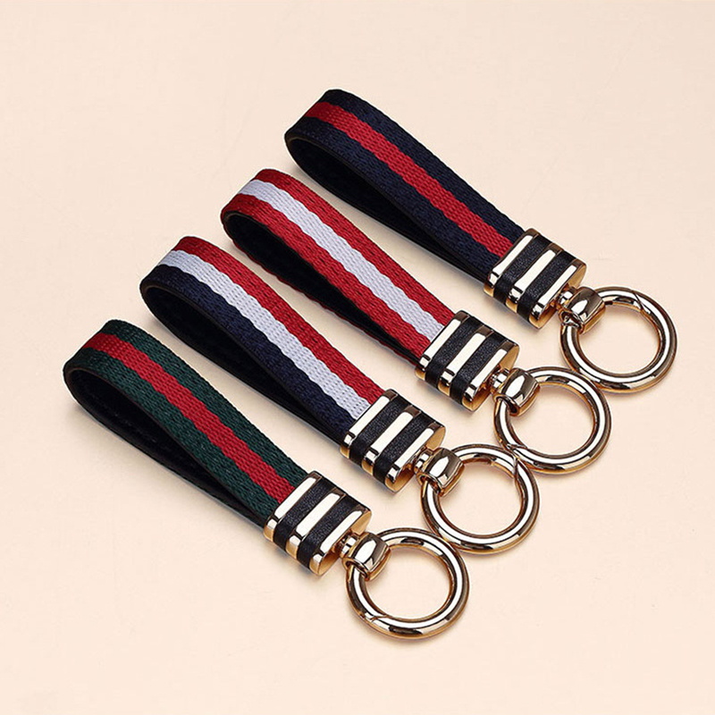 Multi - color striped webbing keychains with metallic accents, trendy and practical, perfect for organizing keys and accessorizing bags.