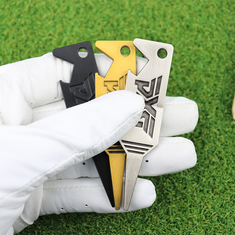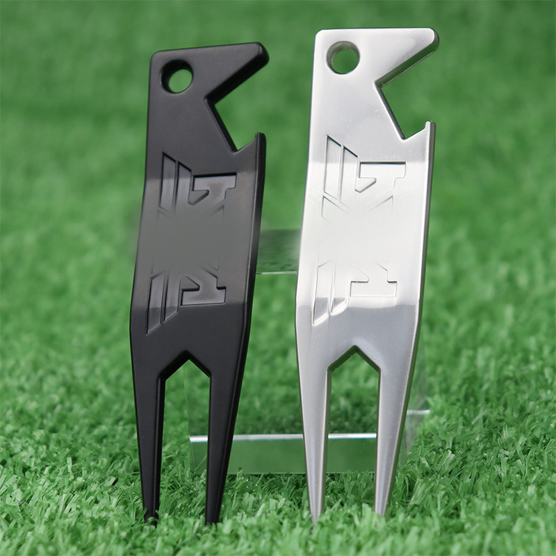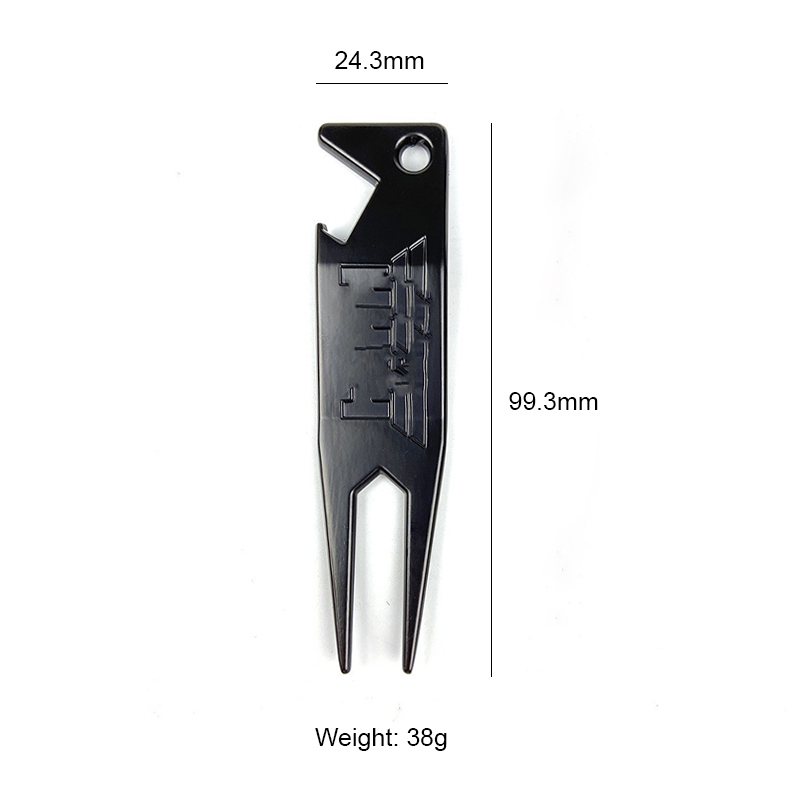 This 2-in-1 tool (black/silver/gold) doubles as a divot repairer and bottle opener, with sleek logo detailing. Durable, stylish—perfect for golfers to fix greens and open drinks effortlessly on the course.