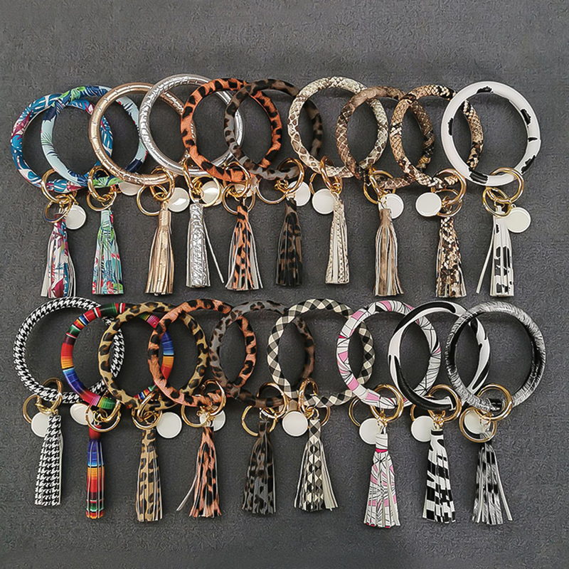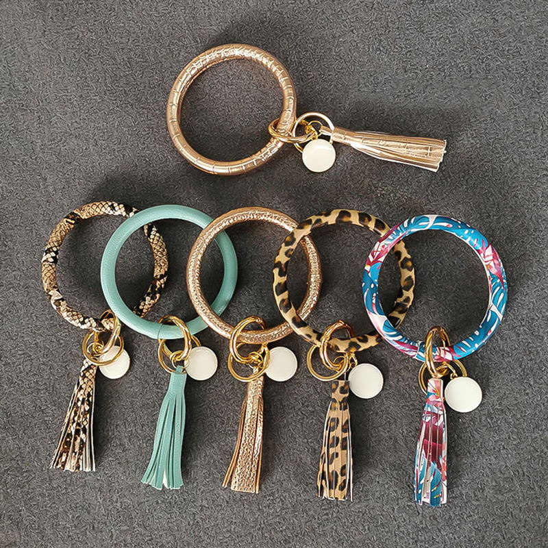 These keychains feature bangle-style rings made of fabric or faux leather in various patterns like prints, animal prints, and geometric designs, paired with tassel charms. Ideal for women, they’re perfect for accessorizing bags or keys during daily commutes, shopping sprees, or social gatherings, offering a trendy and versatile option for fashion-conscious individuals.