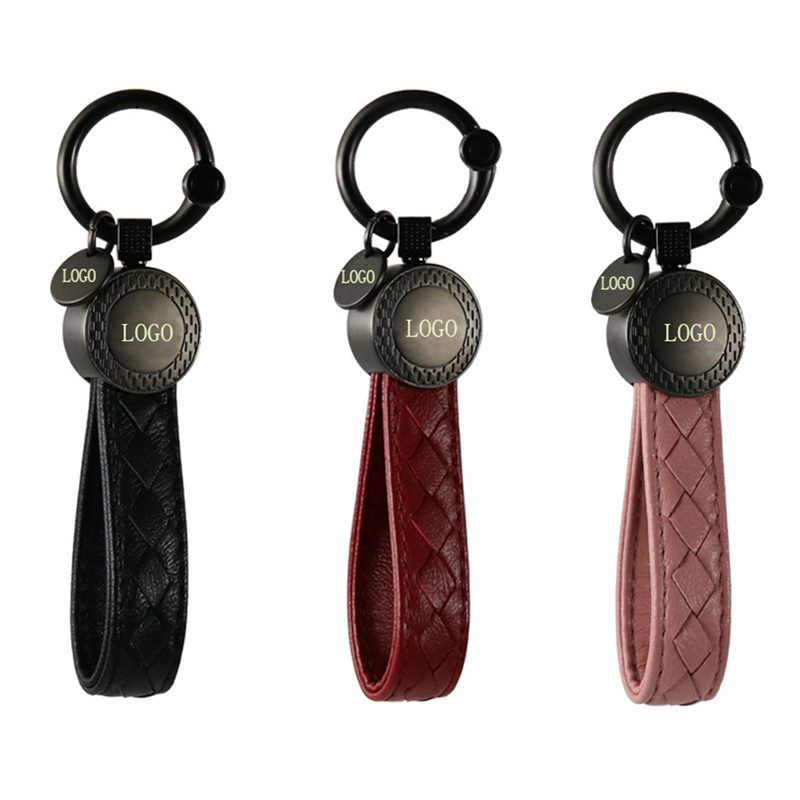 These keychains feature braided leather straps in black, claret, and pink, each with a metal ring and circular logo embellishments. They blend sleek design and craftsmanship, ideal as stylish, customizable accessories.