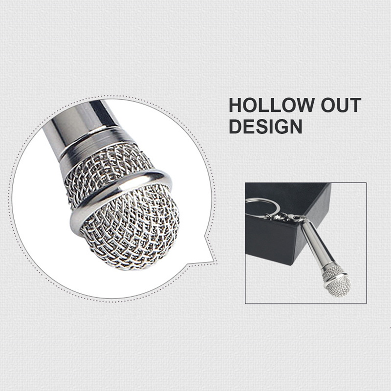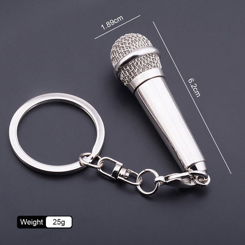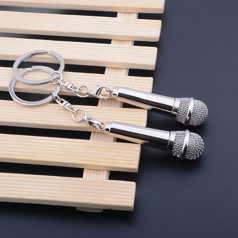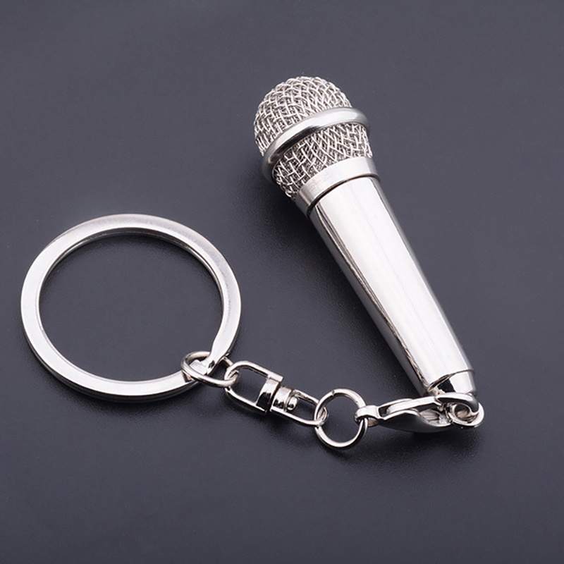 These silver metal microphone keychains have detailed mesh heads and sleek bodies, attached to metal key rings. With a music-themed design and polished finish, they are stylish accessories for music enthusiasts.