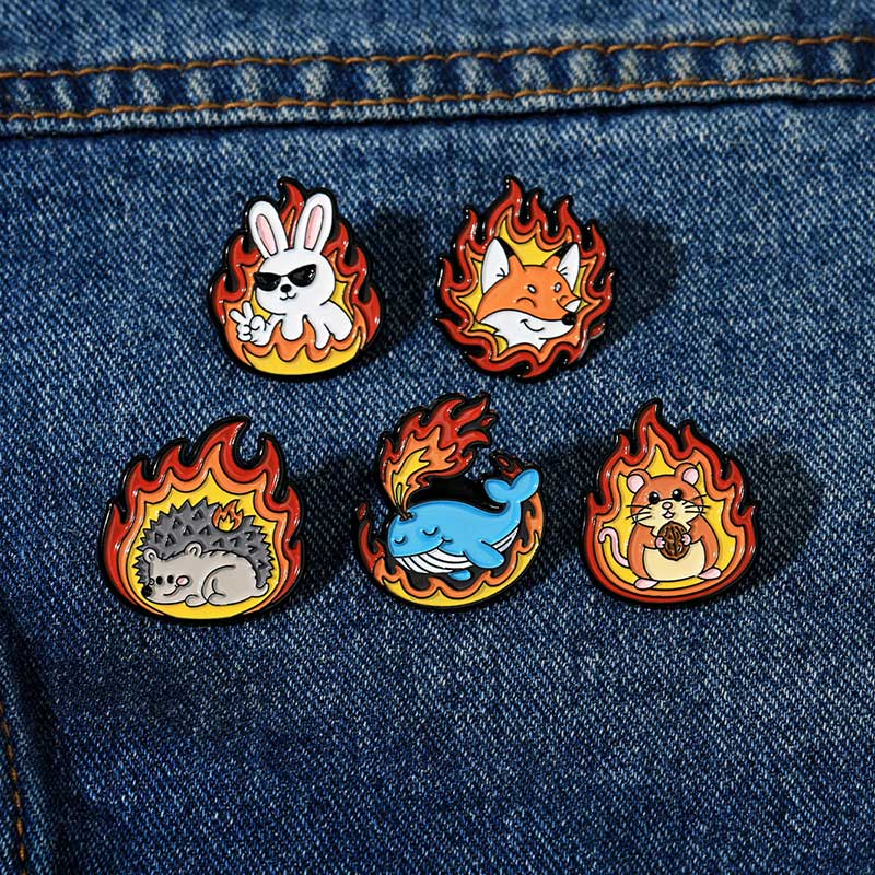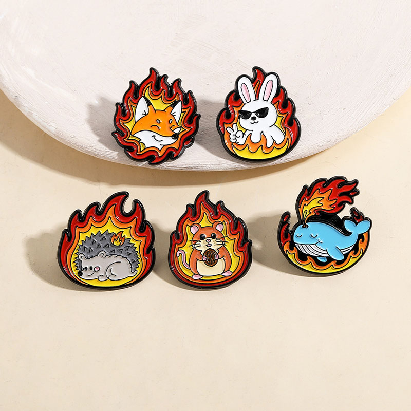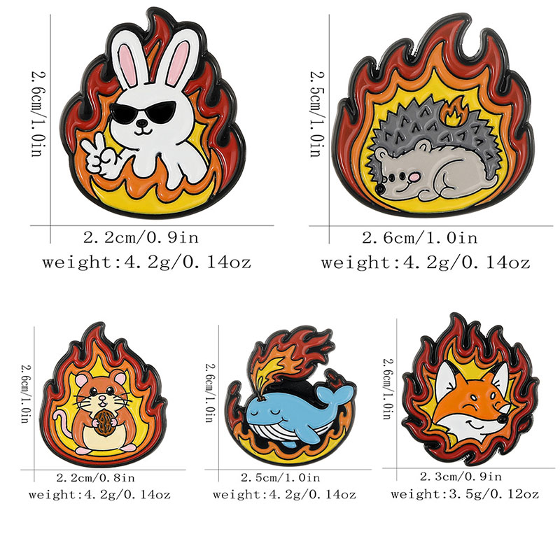 Features 5 glossy designs (hedgehog, hamster, fox, whale, bunny) wrapped in vibrant flames—quirky, bold vibes. Perfect for trend fans to add edgy-cute flair to bags/jackets, ideal for daily styling or playful statement accessory decor.