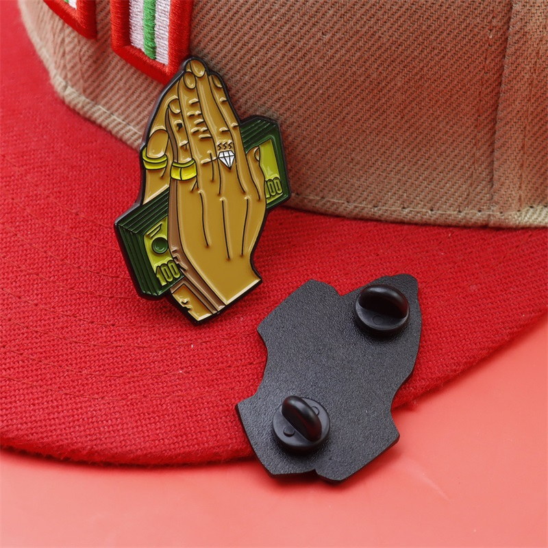 This pin features a unique, merged shape: praying hands layered over a stylized cash bill silhouette. Designs include glossy gold tones, diamond ring details, and vibrant green accents—blending symbolic motifs with bold, modern styling for a standout, personality-driven accessory.