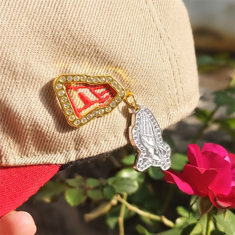 These pins boast a rhinestone-trimmed triangular main piece paired with butterfly-contoured praying hands pendants. Designed with textured hand details, gold chain links, and polished metallic finishes, they merge distinct silhouettes and sparkling accents for eye-catching cap styling.