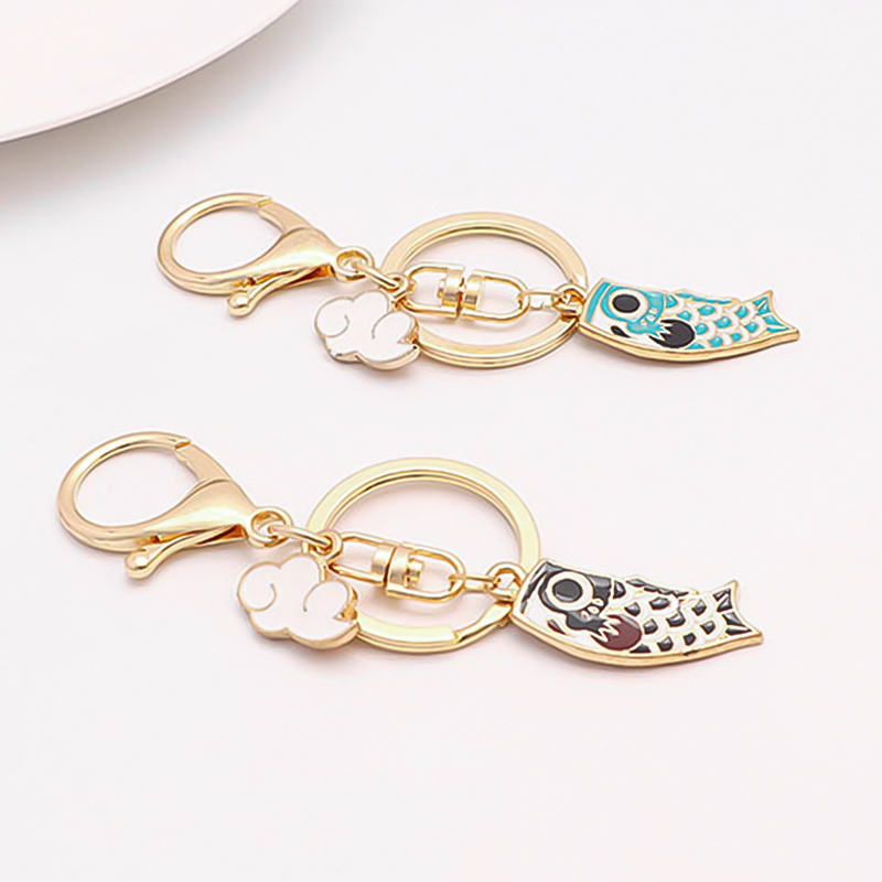 These keychains feature colorful koi fish enamel charms (red and blue) with intricate patterns, paired with gold metal rings, clasps, and cloud-shaped accents. The detailed enamel work and metallic finish create a vibrant, culturally inspired design.