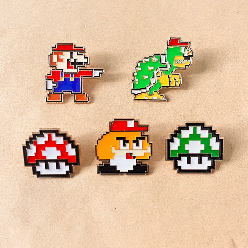 These pins sport sharp 8-bit pixel shapes (character silhouettes, mushroom icons) with bold, retro-color enamel. They attach easily to backpacks, denim jackets, or lanyards—perfect for gaming fans to infuse nostalgic charm into daily accessories or showcase as a classic game-themed collection.
