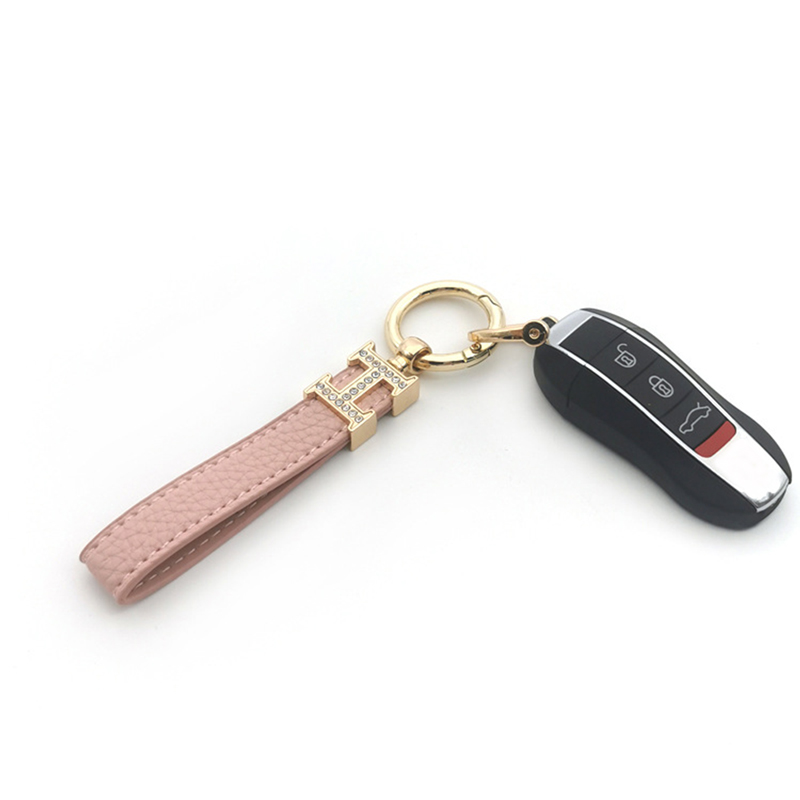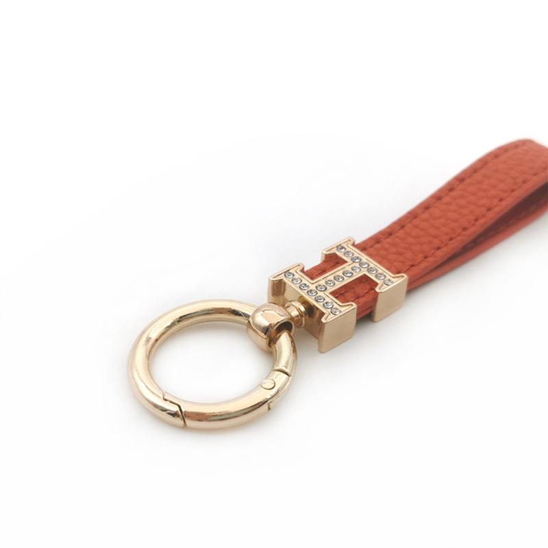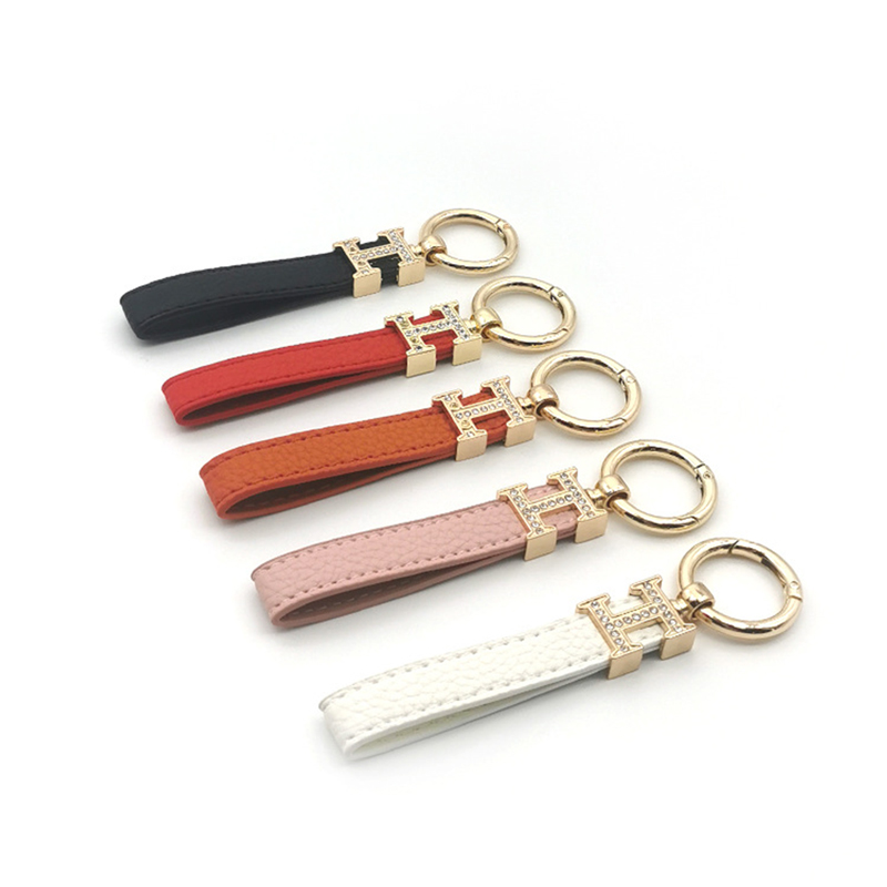 These leather keychains feature a stylish design with a golden "H" embellished with crystals, paired with leather straps in colors like Black, red, orange, pink, white, adding a touch of elegance and versatility to your keys or bags.