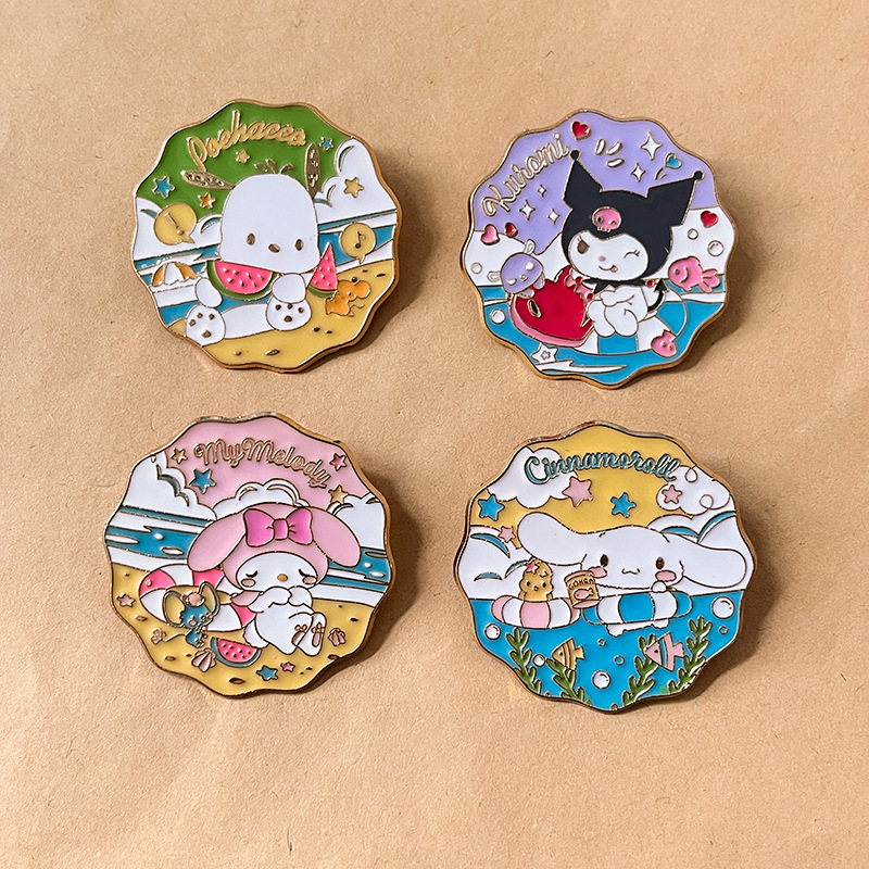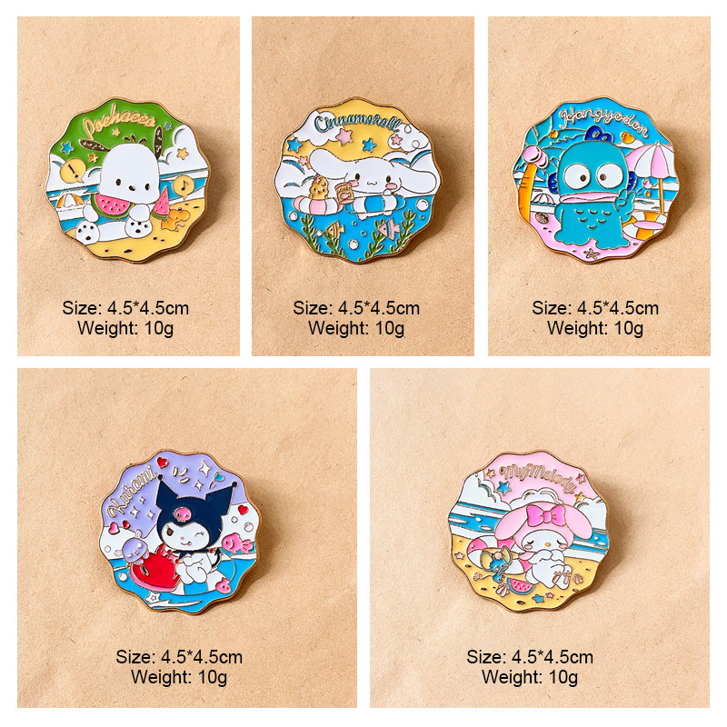 Features Sanrio characters (Cinnamoroll, My Melody, etc.) in beach scenes with vibrant, playful enamel. Ideal for adding cute summer flair to bags, jackets, or hats—perfect for fandom styling or seasonal accessory accents.