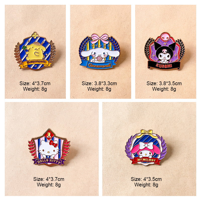 5 iconic Sanrio designs (Hello Kitty, Cinnamoroll, Kuromi, etc.)—vibrant, fan-loved flair. Perfect for Sanrio fans to style bags/jackets; ideal for daily wear or cute collectible decor.