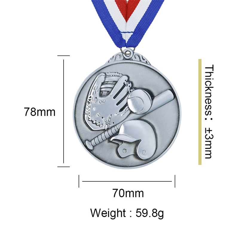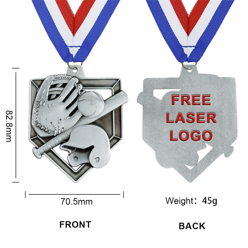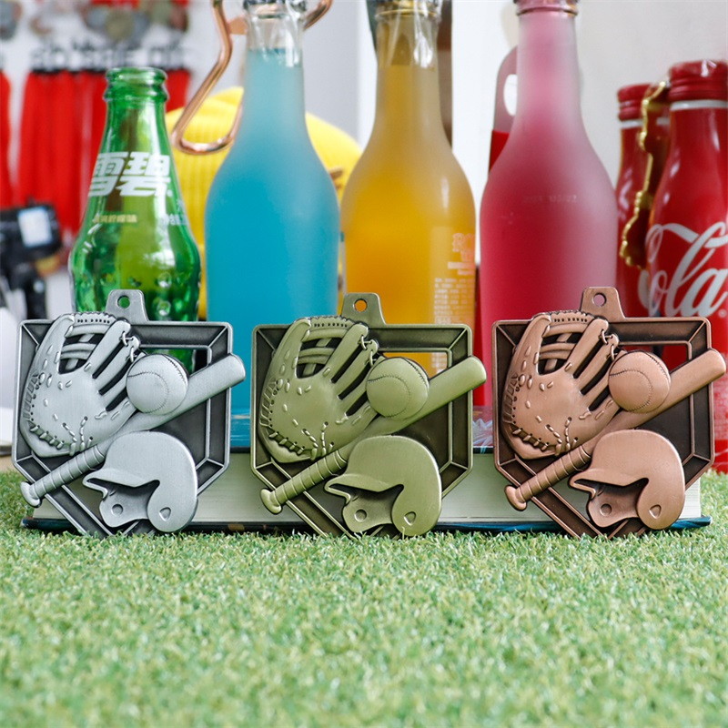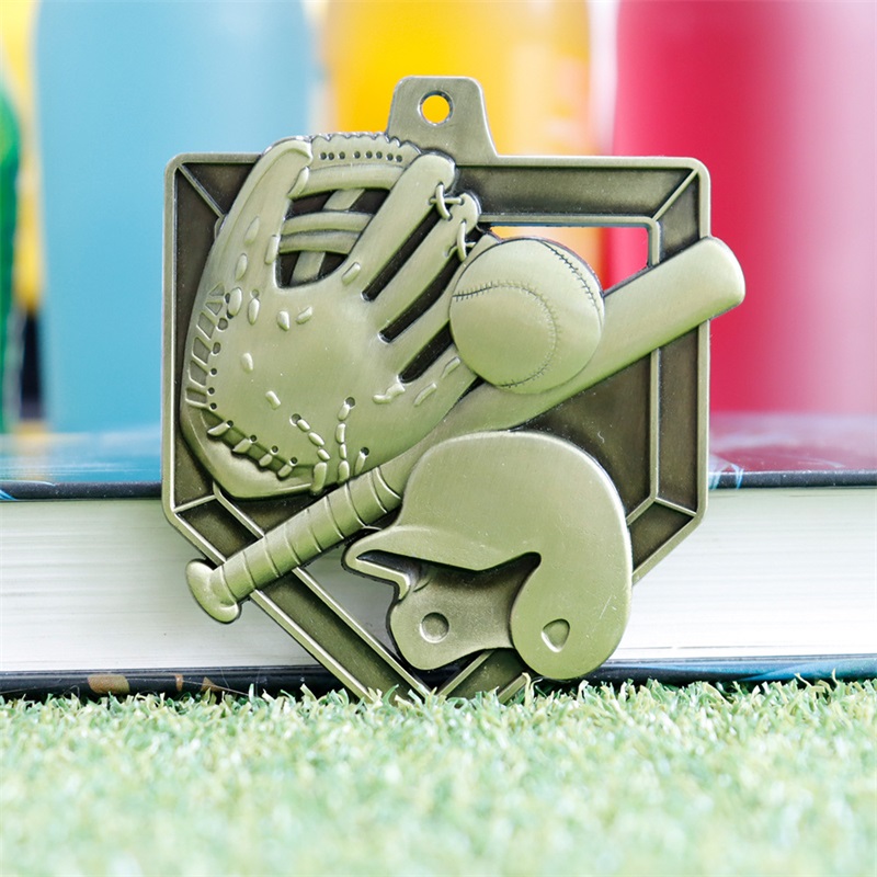 These shield-shaped baseball medals—crafted in antique gold, silver, and copper—boast sleek cut-out designs framing detailed motifs of gloves, bats, balls, and helmets. Their angular, structured form adds a bold, sporty flair, ideal for honoring athletes at baseball tournaments and elevating award ceremony presentations.