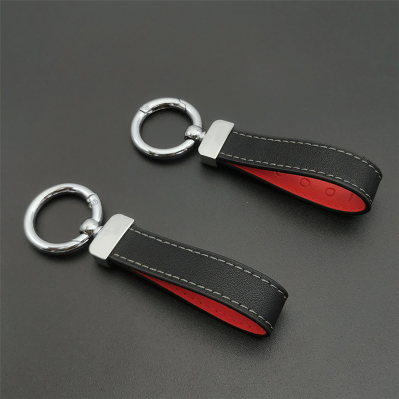 This keychain features a black leather strap with red lining and white stitching, paired with a shiny silver metal ring. It blends sleek design and contrasting colors, making it a stylish and durable accessory.