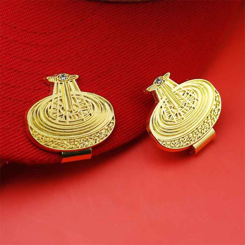 This hat clip features a curved, layered shape (resembling ornate decor) with detailed geometric/filigree patterns. The design blends a glossy gold finish, sparkling accent, and sleek clip structure—merging luxurious aesthetics with practical functionality for a standout accessory.
