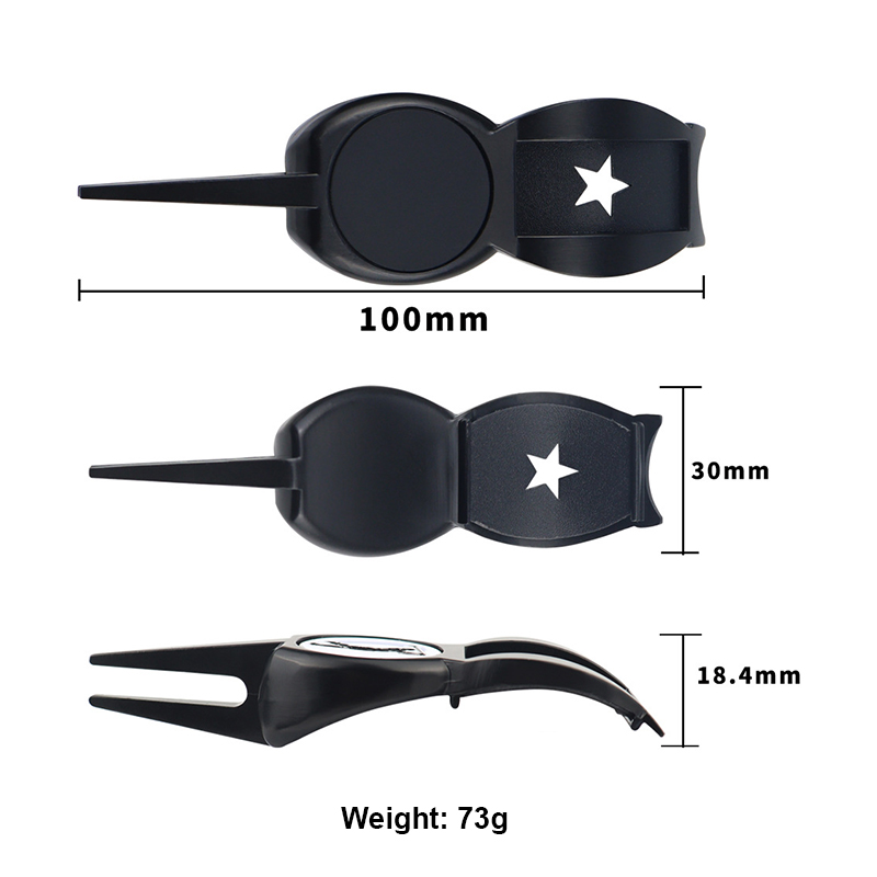 This 73g (100mm) tool (black/silver) has a curved, clip-style shape—clips to clubs for portability. It includes a magnetic golfer-silhouette ball marker, fixes green divots smoothly, and adds a sleek, functional touch to golf gear.