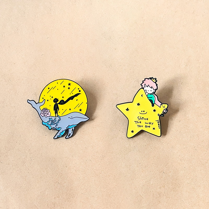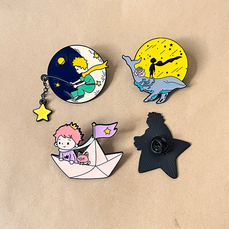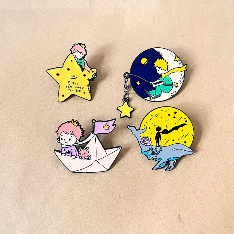 These The Little Prince soft enamel pins feature iconic shapes—the prince, rose in glass dome, fox—with vibrant hues separated by raised metal lines . They adorn blazers, bags, or scarves, letting fans infuse outfits with literary nostalgia and premium tactile charm .