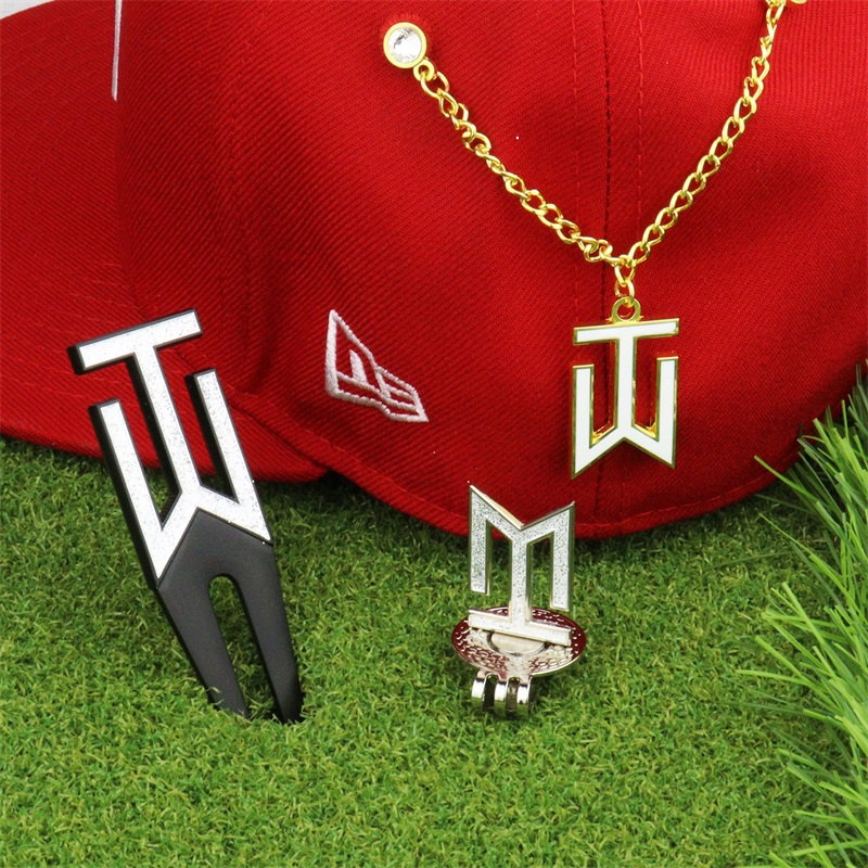 Stylish Cap Decor & Golf AccessoryFeaturing distinct logo silhouettes in metallic finishes, a gold chain-adorned hat pin, and a logo-shaped golf divot tool—ideal for sprucing up caps while serving practical golf use with trendy, unique styling.